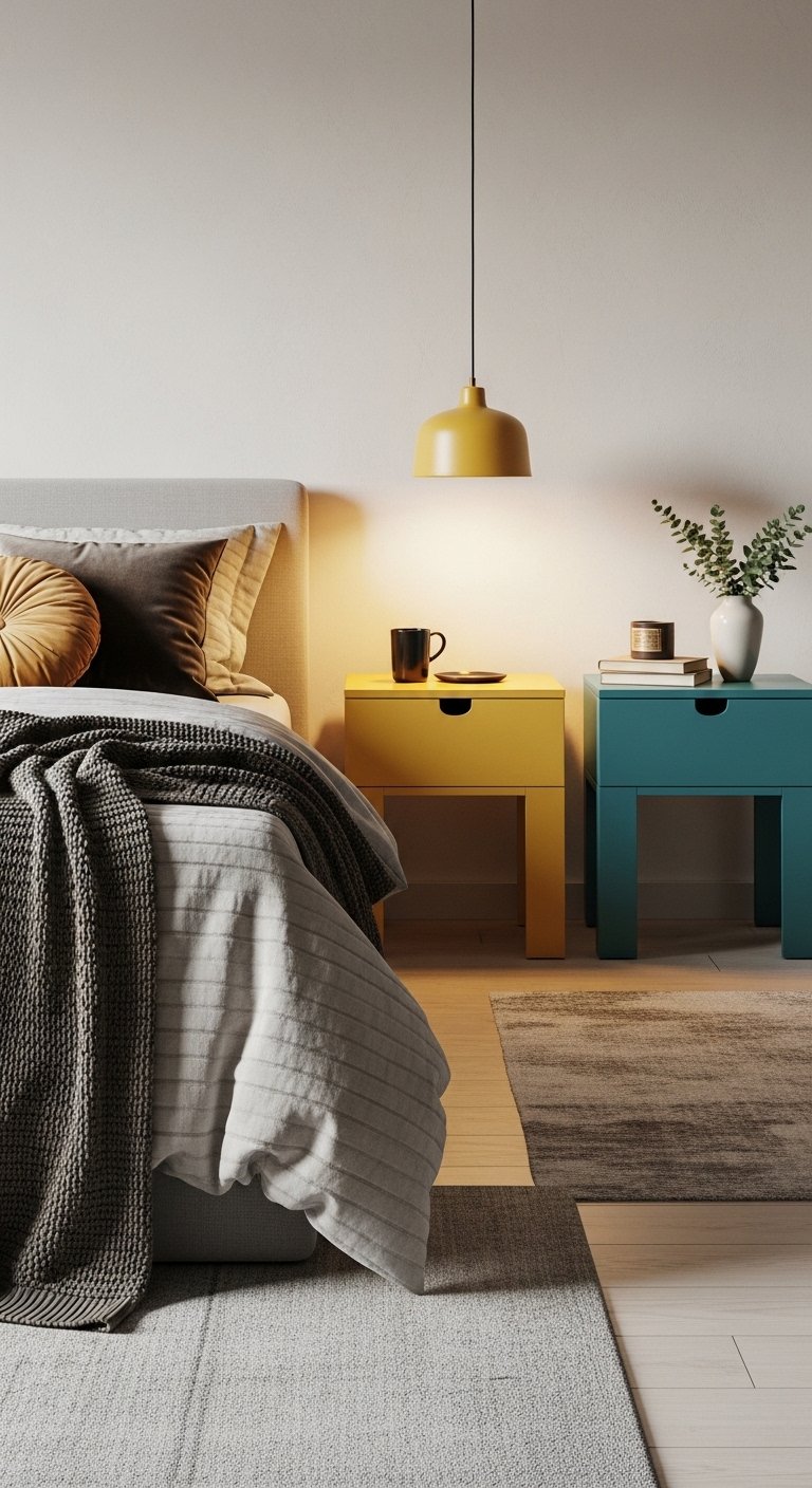 Instead of neutral nightstands, choose bedside tables painted in bold, complementary colors like mustard, teal, or coral. These functional pieces become focal points, elevating the bedroom’s style instantly. Pair with neutral bedding and simple décor to maintain balance, while small accessories—like lamps, vases, or framed art—can echo the table’s color for cohesion. Artistic or vintage tables with unique shapes or mixed materials add personality, depth, and tactile interest. This technique transforms everyday furniture into design statements, making the room Pinterest-worthy, sophisticated, and playful. It demonstrates that even small, functional items can carry bold color and style, creating a curated and visually engaging adult bedroom environment.