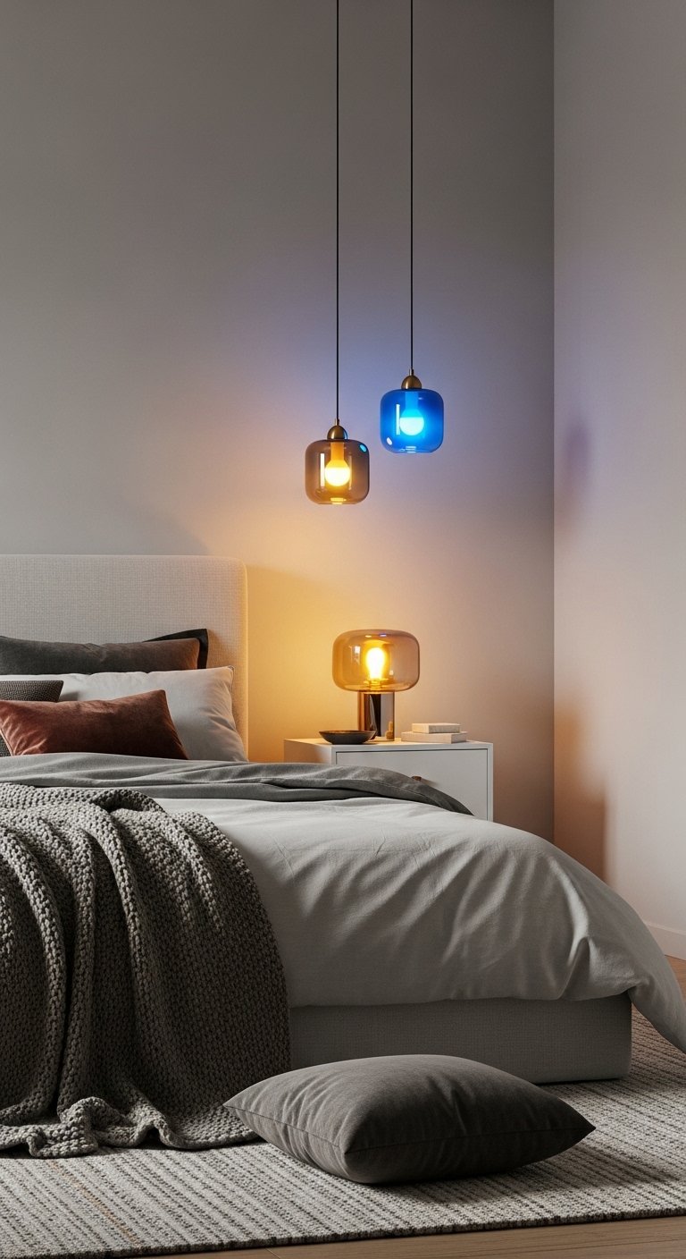 Lighting can double as a design statement when used to introduce color. Consider lampshades, pendant lights, or LED strips in vibrant hues like cobalt blue, coral, or amber. These colored lights create atmosphere, highlight textures, and reinforce the bedroom’s color palette. Pair with neutral walls, bedding, and furniture to prevent visual overload. Metallic fixtures or reflective surfaces amplify the effect, bouncing light and enhancing depth. Colored lighting allows flexibility—swap shades or use dimmers for changing moods. It’s a modern, Pinterest-worthy approach for adult bedrooms, combining functionality, ambiance, and style. With thoughtful placement and complementary colors, lighting becomes both practical and decorative, giving the space a playful yet sophisticated energy.