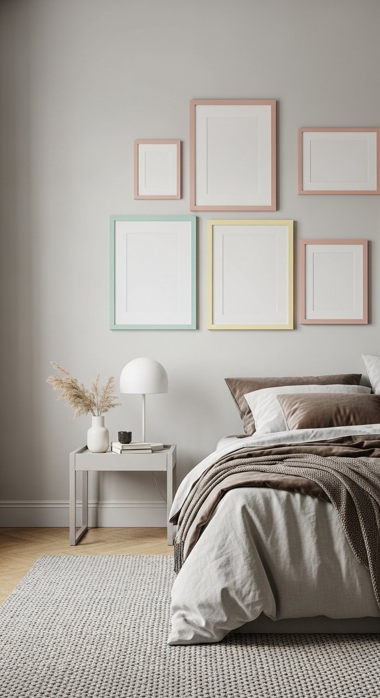 Transform a plain wall into a lively gallery by using colorful frames in varying sizes and shapes. Choose artwork, photographs, or prints that incorporate your bedroom’s main accent colors to create a cohesive, curated look. Mixing frame textures—wood, metal, and acrylic—adds depth and sophistication, while strategically arranging the pieces keeps the display balanced. Gallery walls act as both decoration and personality statement, reflecting your taste without overwhelming the room. Add subtle accent lighting like small picture lights or a floor lamp to highlight the colors and create warmth. This approach allows adults to showcase personal style, infusing energy into the bedroom in a Pinterest-worthy way. With thoughtfulness in color selection and layout, a gallery wall becomes a functional, stylish focal point that inspires creativity, making your bedroom feel curated, playful, and professionally designed.