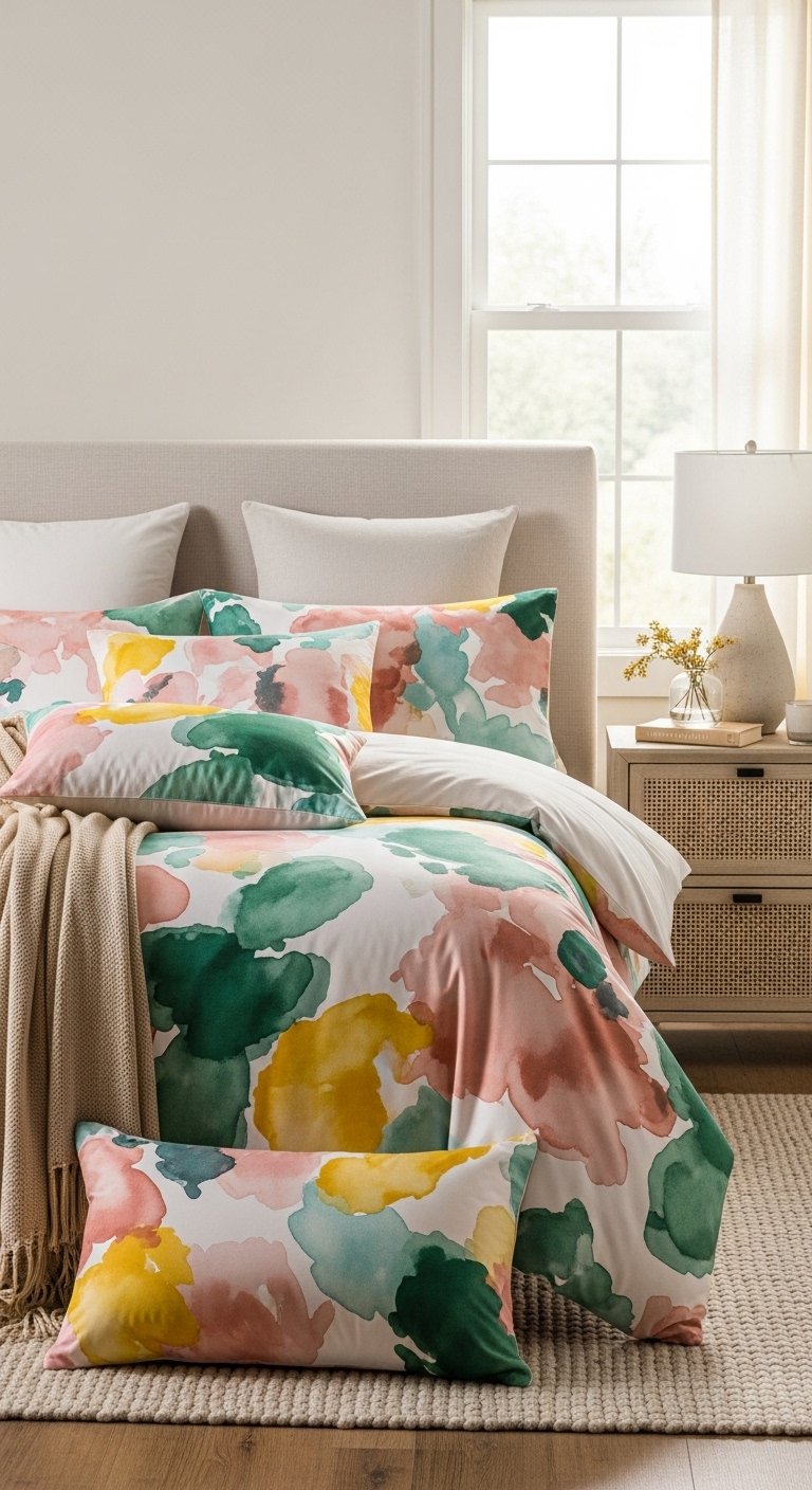 For a dramatic and stylish finish, choose statement bedding that incorporates bold colors, patterns, or artistic prints. Think oversized floral designs, geometric shapes, or abstract watercolor effects in multiple vibrant hues. Anchor the room by coordinating small accessories such as cushions, lamps, and rugs with colors drawn from the bedding. Keep walls neutral to allow the bedding to remain the focal point, while layering textures like knitted throws, velvet pillows, and linen sheets for depth. Statement bedding instantly elevates the bedroom, making it visually rich, cozy, and Pinterest-ready. This approach proves that with thoughtful color selection and layering, the bed itself can define the room’s personality, style, and mood, transforming an adult bedroom into a curated, playful, and sophisticated sanctuary.