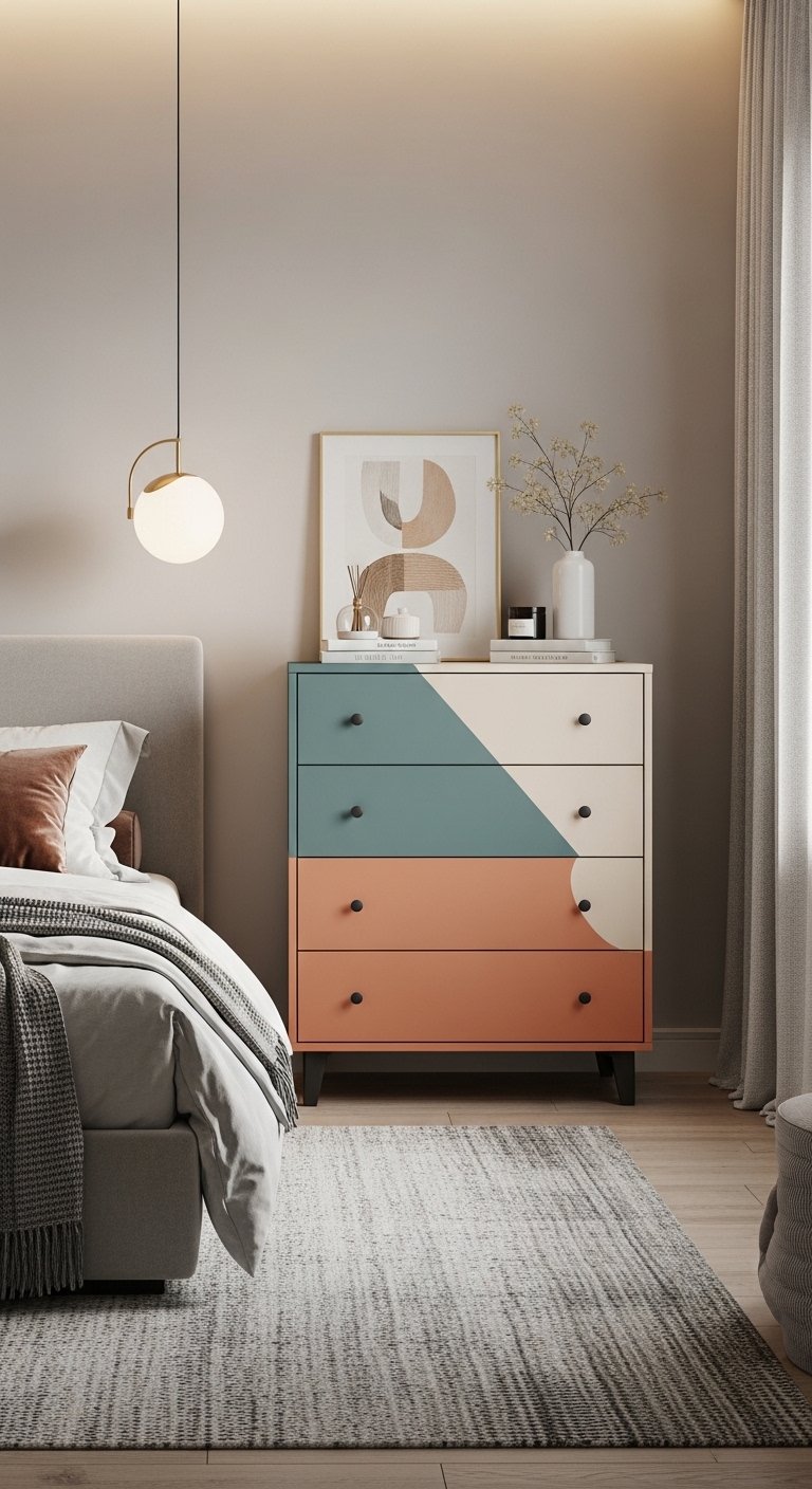 Instead of painting walls, turn furniture into the focal point with color-blocked designs. Consider a dresser with drawers painted in complementary shades, a two-toned bed frame, or a desk in bright contrasting colors. This technique adds energy and personality while keeping walls and large surfaces neutral, which makes the space feel balanced. To avoid visual chaos, limit color-blocking to one or two pieces per room and choose tones that harmonize—soft pastels or muted jewel shades work particularly well. Pair the furniture with minimalist bedding, neutral rugs, and simple wall art so that the bold pieces shine. Color-blocking furniture allows easy updates over time; a fresh coat of paint can transform the room’s mood entirely. The result is a vibrant, adult-friendly bedroom with a modern, Pinterest-worthy aesthetic that feels fun, stylish, and completely unique.