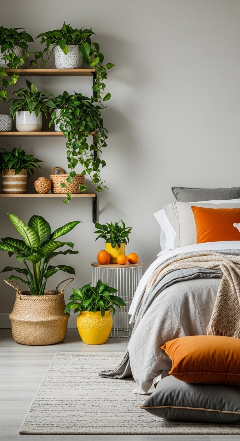 Bring the outdoors inside by pairing lush green plants with pops of citrus-inspired color like lemon yellow or tangerine orange. Plants naturally add texture, life, and freshness, while the citrus accents energize the space. Use a mix of small potted plants on shelves, trailing vines along windows, and a larger statement plant in a corner to create visual depth. Coordinate textiles such as cushions, throws, or rugs in soft citrus hues, ensuring the colors complement rather than compete. Woven baskets, ceramic planters, and natural wood elements enhance the organic feel while adding warmth and character. The combination of green and bright citrus creates a Pinterest-perfect adult bedroom: lively, cheerful, and stylishly layered. This method is practical and instantly transformative, requiring only small, well-placed accents to create a bold, fresh, and memorable environment.