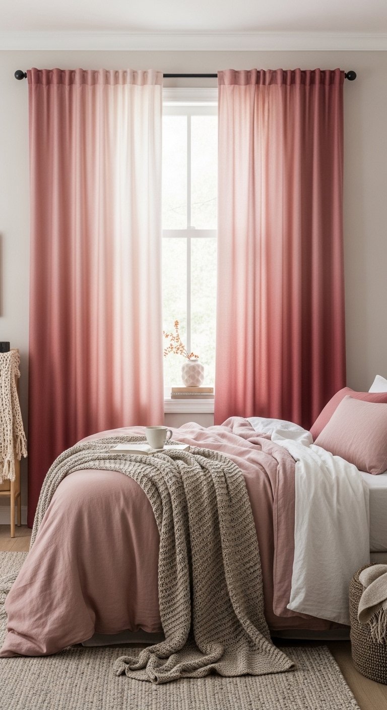 Ombre textiles offer a soft, flowing visual interest in adult bedrooms without overwhelming the senses. Consider a duvet that fades from soft blush to deep rose, or curtains transitioning from light teal to rich navy. This gradual shift in tone adds depth, movement, and sophistication, acting almost like an artwork on fabric. Pair the ombre with solid-colored sheets, a neutral rug, and understated wall décor to maintain balance. Layer different textures, such as linen pillows, silk throws, or knitted blankets, to enhance the tactile experience. Ombre creates a serene yet dynamic atmosphere, perfect for a bedroom intended for rest and style. This approach is versatile, allowing you to update colors seasonally, and provides a Pinterest-friendly look that feels thoughtfully designed, cozy, and visually intriguing.