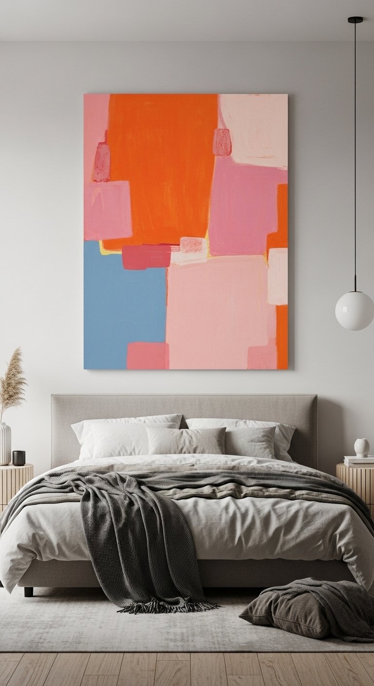 Turn a single wall into a gallery-worthy masterpiece with a large mural, abstract painting, or geometric wall art. Choose a piece that incorporates multiple complementary colors to tie the room together, such as warm oranges, muted pinks, and soft blues. The artwork acts as both a focal point and a color guide, influencing bedding, rugs, and accessories. Keep the rest of the walls neutral to let the art shine without overwhelming the room. Incorporate lighting, such as wall sconces or picture lights, to highlight the piece and enhance its colors. This strategy gives your bedroom a curated, sophisticated feel while remaining playful and inviting. A statement wall is Pinterest-ready, visually stunning, and allows your personality to shine through, turning even a simple space into a designer-inspired retreat.