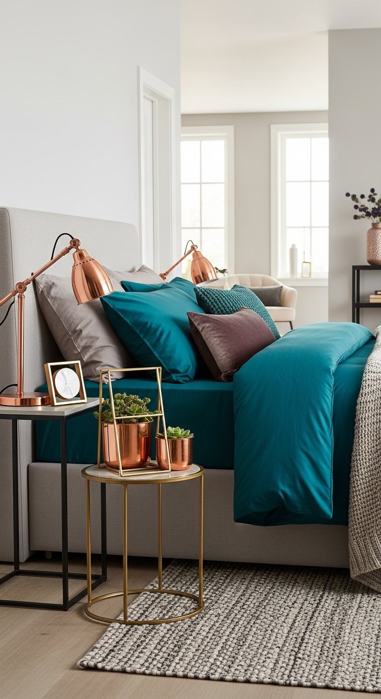 Pair bright colors with metallic finishes to achieve a polished adult look. For example, deep teal bedding complemented by rose gold lamps, brushed brass frames, or copper planters creates warmth, contrast, and reflection. Metallic accents amplify natural light and enhance the vibrancy of surrounding colors, while providing a sense of luxury. Use small touches strategically—such as knobs, picture frames, and decorative trays—to prevent the room from feeling overdone. Combine these accents with rich textiles like velvet cushions or silk throws to create layered sophistication. The interplay of bold colors and metallic shine produces a Pinterest-worthy adult bedroom that is both glamorous and approachable, proving that thoughtful material pairing can transform ordinary colors into a cohesive, elegant design.