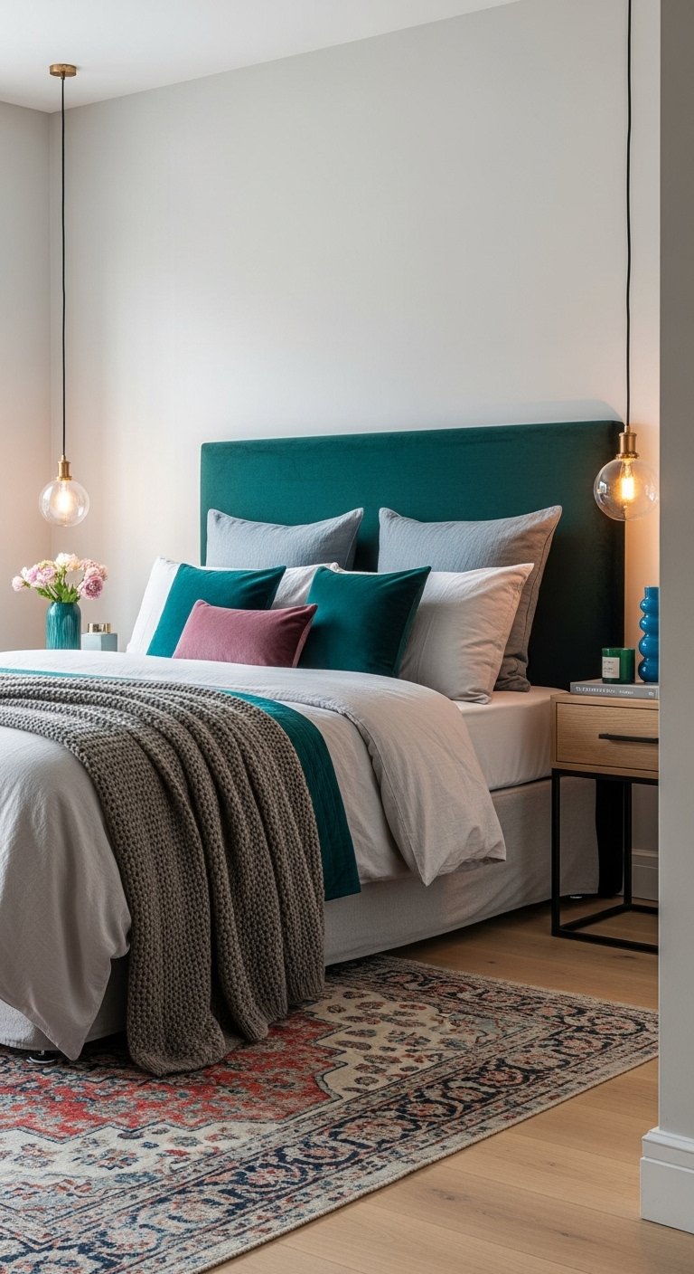 Introduce rich jewel tones through velvet pillows, an accent chair, or a small upholstered bench to instantly elevate your bedroom. Colors like emerald green, sapphire blue, or deep ruby create a sophisticated yet inviting atmosphere that feels expensive without being overwhelming. Velvet’s soft, reflective texture adds dimension, catching natural or ambient light to make the colors glow. Balance these bold accents with neutral walls and bedding—creams, soft grays, or muted taupe—to prevent the space from feeling heavy. To make the look cohesive, add small metallic touches such as brushed gold bedside lamps or picture frames. Layering velvet cushions of varying sizes and patterns, alongside a textured rug or knitted throw, introduces tactile contrast. This approach transforms simple furnishings into a stylish, Pinterest-ready setup that is both visually striking and perfectly adult-friendly, showing how thoughtful pops of color can add warmth and personality.