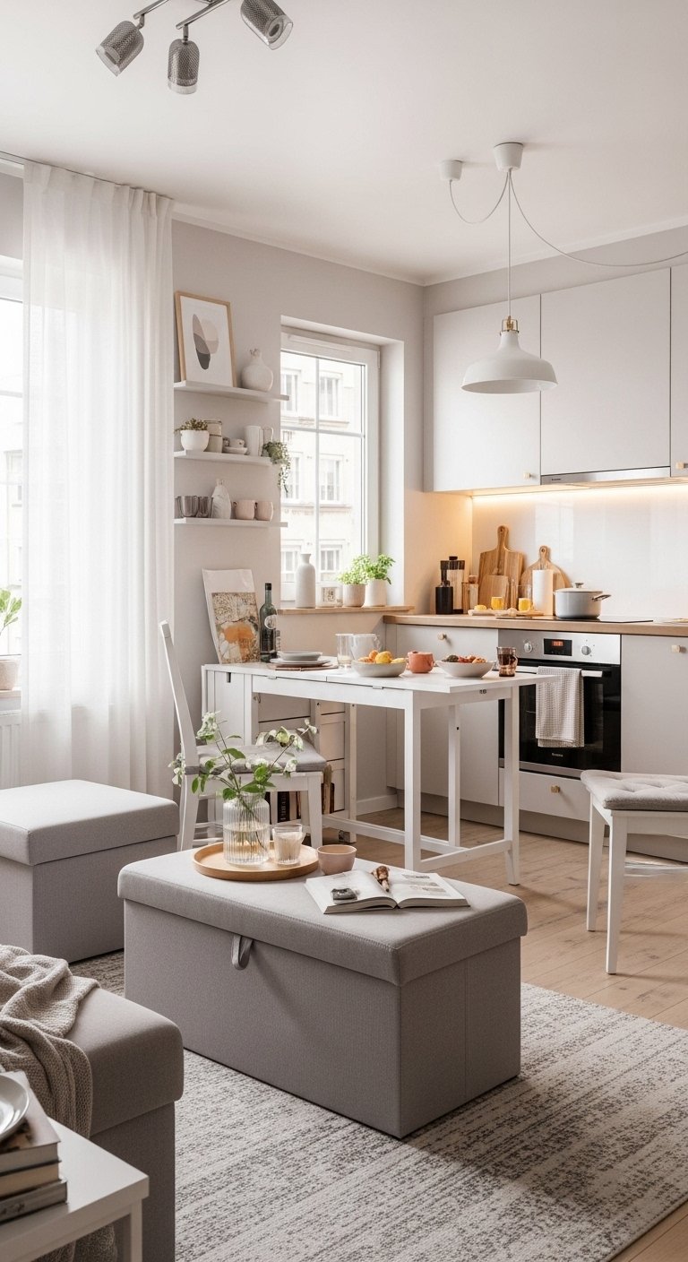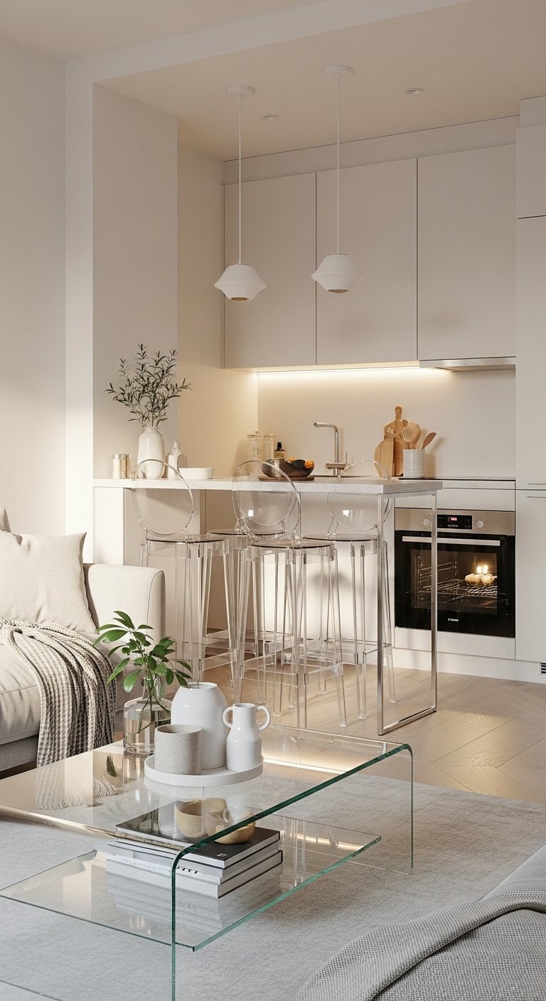Heavy furniture can make a small living room kitchen combo feel crowded. Instead, use glass or acrylic pieces that keep the space visually light. A glass coffee table or clear bar stools allow light to pass through, making the room feel more open.These materials blend easily with any color scheme. They do not block views, which helps both areas feel connected. Pair them with soft textures like rugs or cushions to balance the look.Keep shapes simple and clean. Avoid overly decorative designs so the space stays calm and uncluttered. This idea works especially well in small apartments where every inch matters. It creates the feeling of more space without removing any functionality.