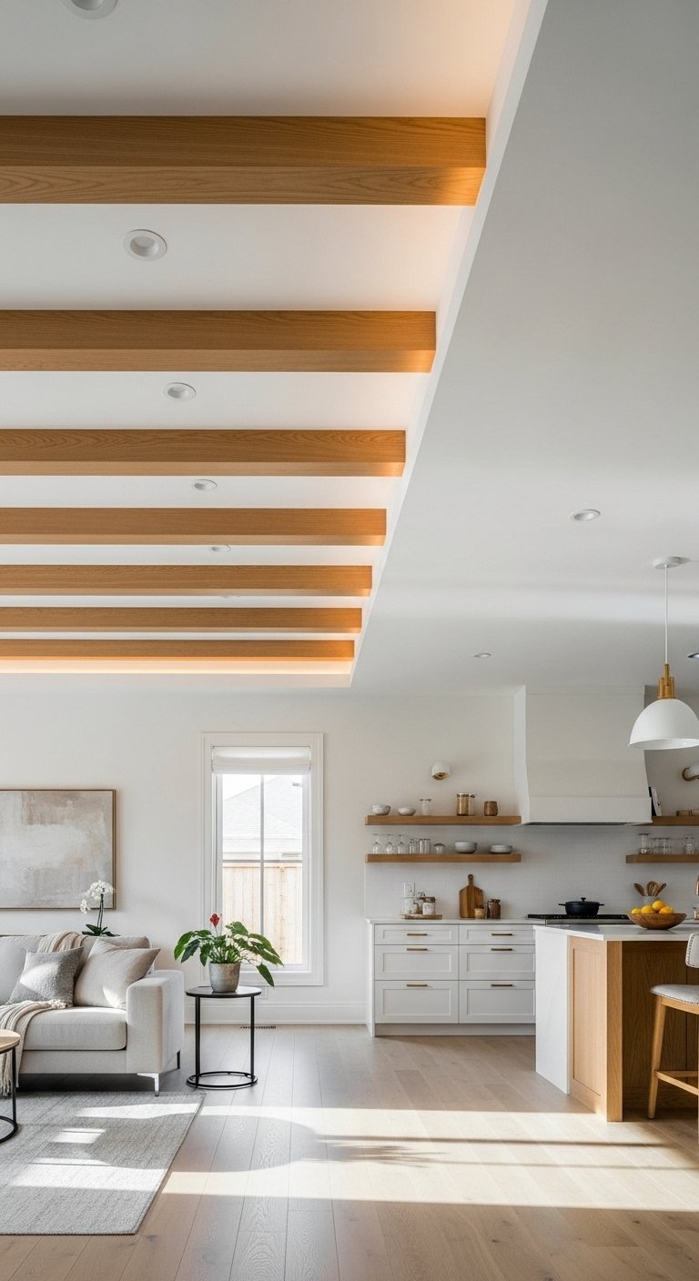 A smart ceiling design can define your living room and kitchen combo without taking up any floor space. Try using a subtle drop ceiling or wooden beams above the living area while keeping the kitchen ceiling plain. This creates a visual boundary that feels natural and open.You can also use different lighting layouts. For example, install recessed lights in the kitchen and a soft pendant cluster in the living area. This change in lighting style helps the eye understand where each zone begins and ends.Keep colors light so the ceiling does not feel heavy. Soft white or pale wood tones work well. This idea is perfect if you want a clean look while still creating structure. It adds depth and interest without making the room feel smaller or crowded.