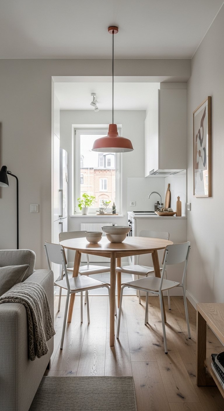 A small dining nook can act as a gentle bridge in your open kitchen living room layout. Place a round table between the kitchen and living area to connect both spaces. Round shapes work best because they allow easy movement around them.Choose light wood or white finishes to keep the space bright. Pair the table with slim chairs or even a built-in bench along the wall to save space. Add a soft cushion or textured fabric to make it cozy.Use a simple pendant light above the table to anchor the nook visually. Keep decor minimal, like a small vase or bowl. This setup gives you a functional dining space while naturally linking both areas together in a smooth and practical way.