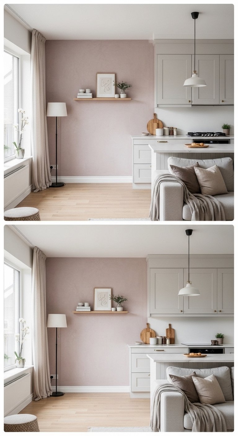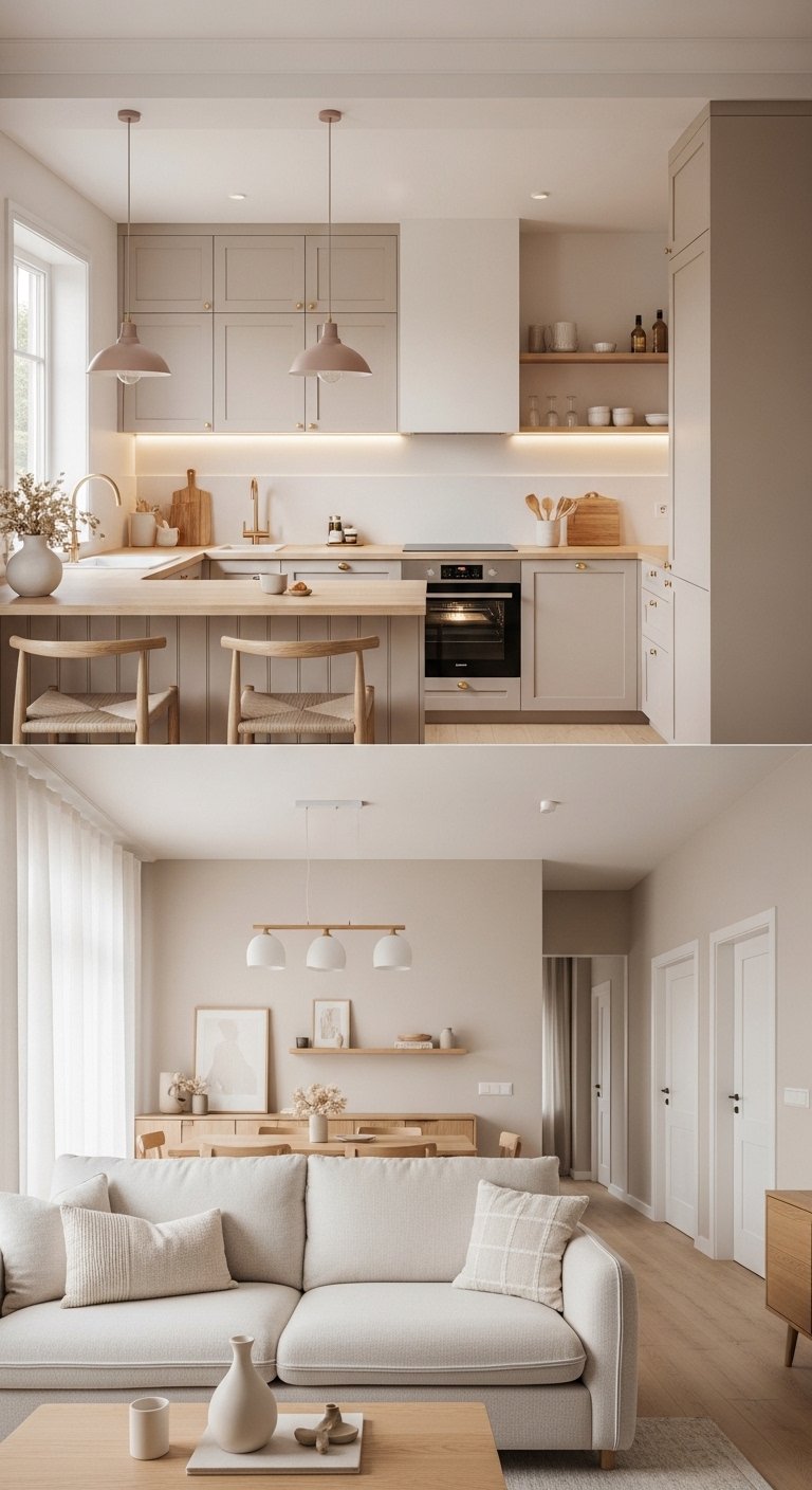 Start by using a soft, continuous color palette across your living room and kitchen combo. This creates a smooth visual flow that makes the space feel larger. Choose one main color like warm beige, soft gray, or light cream, and repeat it in both areas. For example, match kitchen cabinets with your sofa tones or use similar shades in curtains and backsplash tiles.Add small contrast through textures instead of bold colors. A matte wall finish paired with glossy tiles or a linen sofa next to smooth cabinets adds depth without breaking the flow. Keep lighting warm and even so both areas feel connected at all times of day. This idea works best when you avoid sharp color breaks and focus on calm transitions that guide the eye naturally through the space.