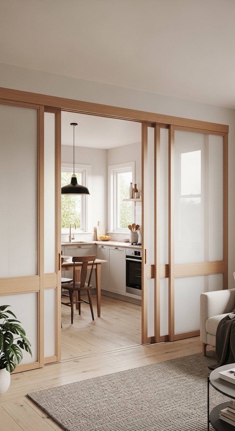 Sliding panels give you the option to separate your open concept living and kitchen when needed. Choose lightweight panels in wood, frosted glass, or fabric. They can stay open most of the time and close only when you want privacy or to hide kitchen mess.Install them on a simple track system so they move smoothly without taking extra space. Keep the design minimal so they blend with your overall style. Neutral tones work best to keep the room feeling open.This idea is perfect for people who want flexibility. You get the openness of a combo layout with the option to divide spaces when required. It adds function without permanent changes to your layout.