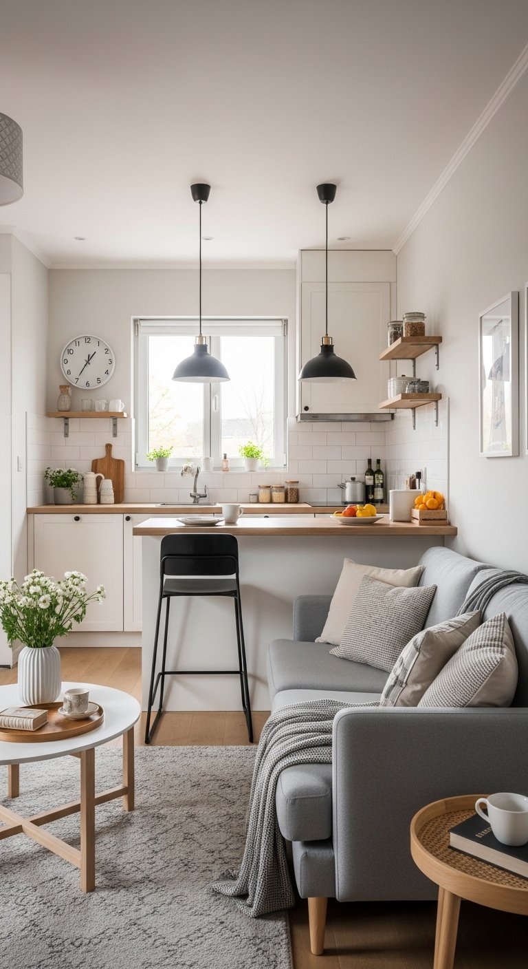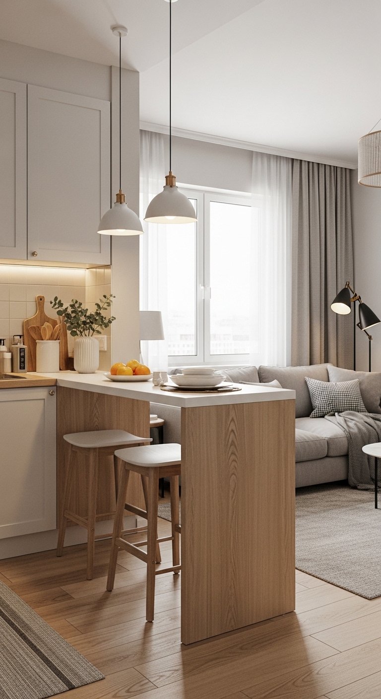 A narrow kitchen island works as a smart divider while adding function. In a small living room kitchen combo, space matters, so choose a slim design with built-in storage. Use it to store cookware, small appliances, or even books and decor on the living side.Keep the surface clean and uncluttered. A light wood or white finish helps reflect light and keeps the area feeling open. Add two simple stools to turn it into a quick dining spot without crowding the room.For a modern touch, mix materials. A wooden base with a stone top adds texture without feeling heavy. Use pendant lighting above the island to highlight the space and create a visual anchor. This idea blends both areas while giving you extra storage and seating in one compact design.