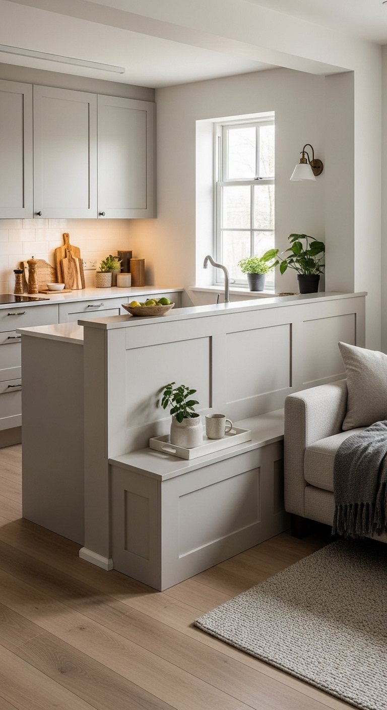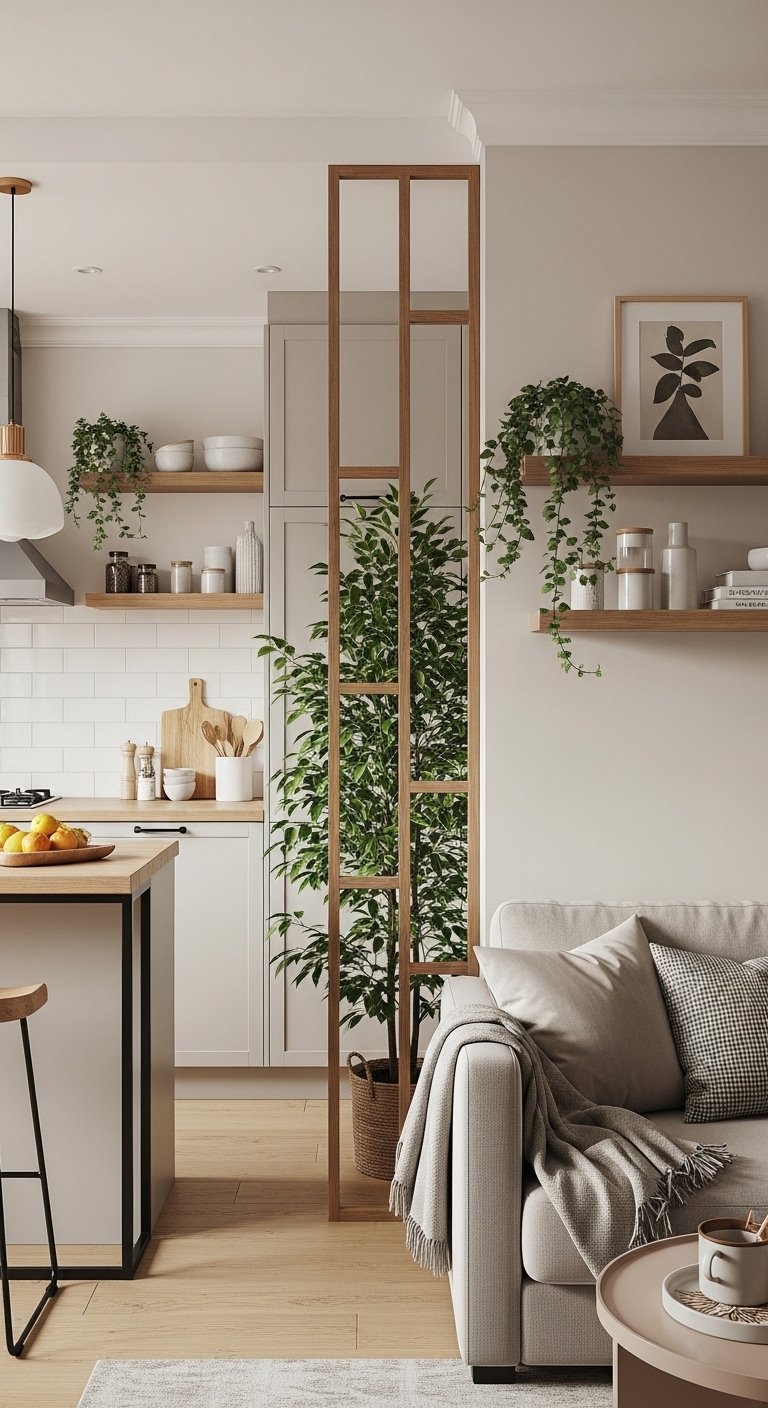 A low partition can gently divide your living room and kitchen combo while keeping the space open and bright. Choose a half-wall or a low cabinet that does not reach full height. This keeps sightlines clear but still creates a sense of structure.You can use the top surface for decor like a small plant, books, or a simple tray. Keep the design light in color so it does not feel heavy. A smooth finish or soft wood texture works best for a calm look.Place the partition where the kitchen ends and the living area begins. This creates a natural boundary without blocking movement or light. It is a simple and practical way to organize your layout without making the space feel smaller.