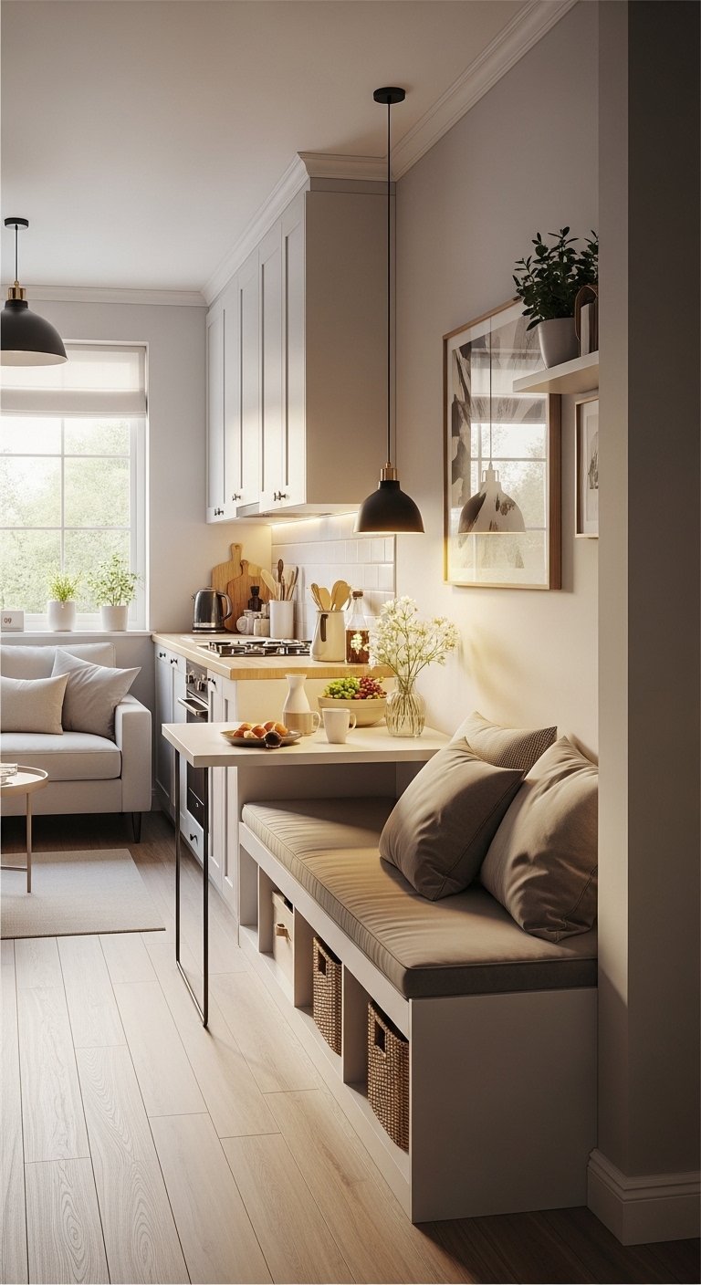 Built-in seating is a smart way to save space in a living room and kitchen combo. Install a bench along a wall that can serve as both dining seating and extra lounging space. This reduces the need for multiple bulky chairs.Add soft cushions and neutral fabrics to keep it comfortable. You can include hidden storage under the bench for extra function. Keep the design simple so it blends with both kitchen and living styles.Pair the seating with a small table or place it near your dining nook. This idea works well in narrow spaces where flexibility is important. It keeps the layout open while adding practical seating that does not take up too much room.