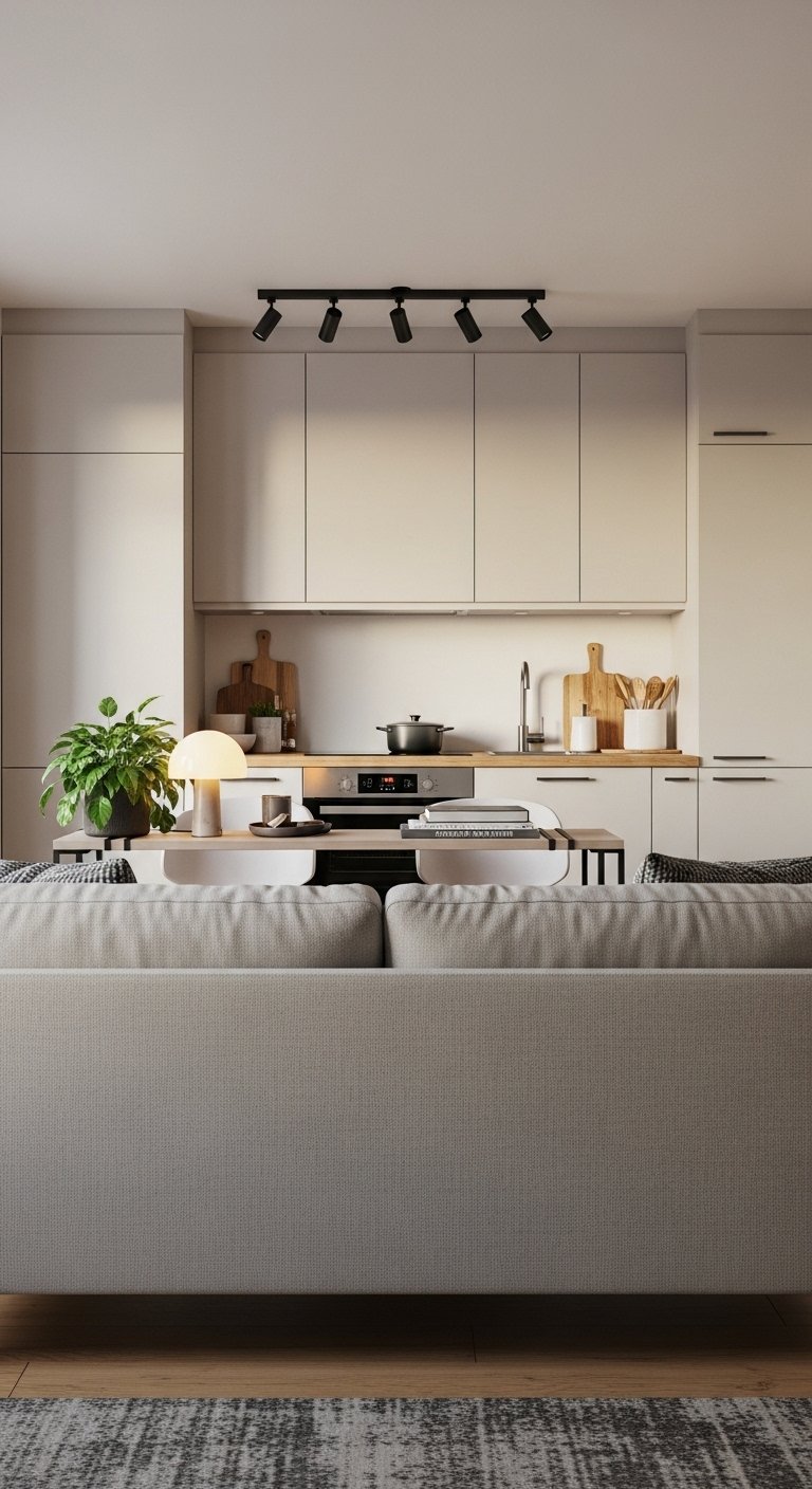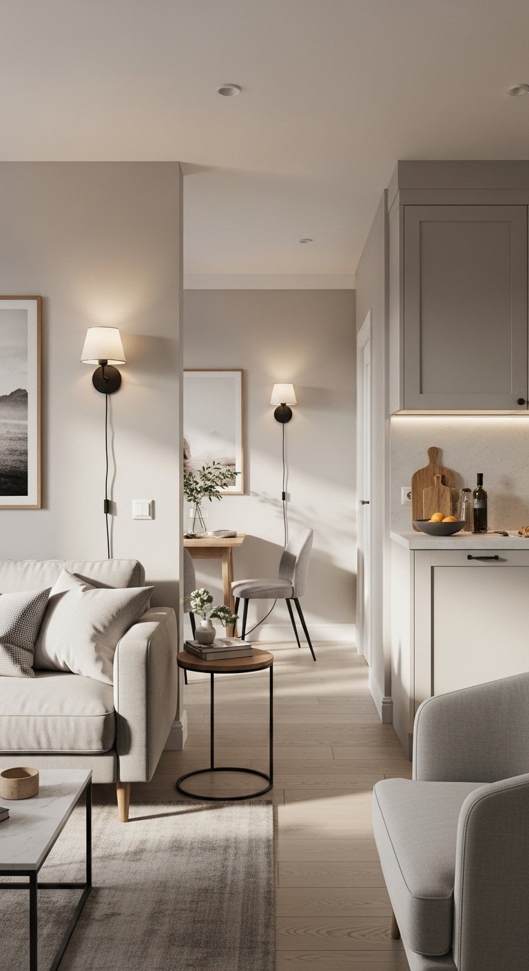 Wall-mounted lighting is a smart choice for a small living room kitchen combo because it saves floor and surface space. Install sconces in the living area instead of using bulky floor lamps. This keeps pathways clear and open.Choose simple designs that match your kitchen lighting style. Warm light tones create a cozy feel, while adjustable fixtures add flexibility. You can direct light where you need it without cluttering the room.in the kitchen, under-cabinet lighting can match the warmth of your wall lights. This creates a balanced lighting plan across both areas. This idea keeps your space functional while maintaining a clean and uncluttered look.