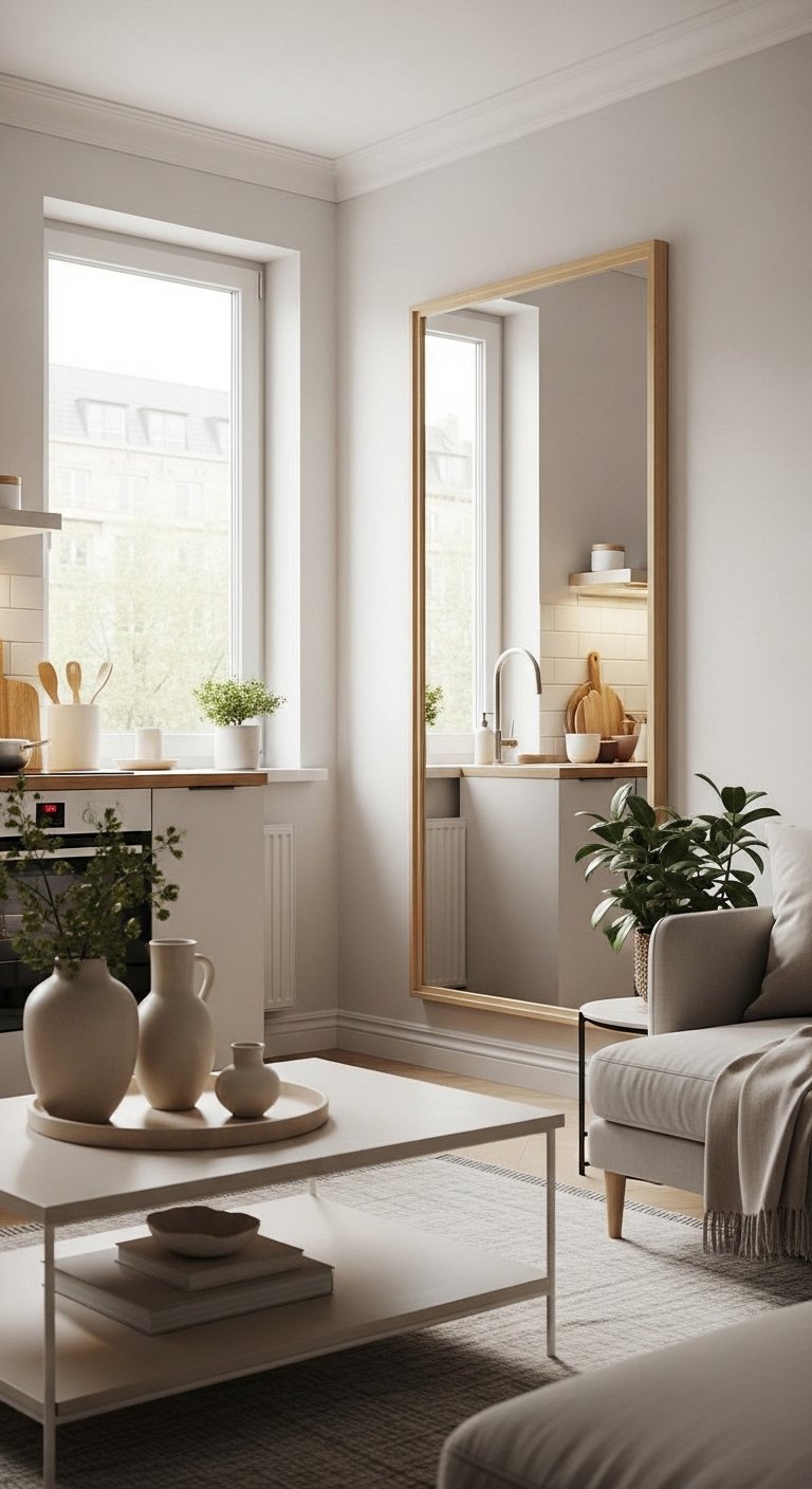 Mirrors can make your small living room kitchen combo feel much larger by reflecting light and views. Place a large mirror on a wall that faces a window or light source. This helps spread natural light across both areas.Choose a simple frame that matches your overall style. Thin metal or light wood frames work best to keep the look clean. Avoid heavy or overly decorative designs that can feel bulky.You can also use mirrored decor pieces like trays or cabinet finishes in small amounts. This adds brightness without overwhelming the space. Mirrors are one of the easiest ways to open up a room while keeping it stylish and functional.