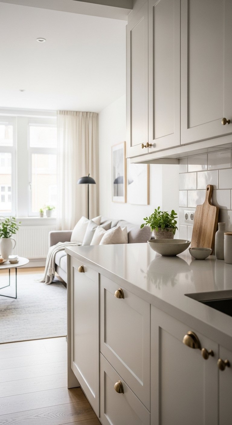 Plants can naturally connect your small open living kitchen while adding freshness. Place medium-sized plants at the edge where the kitchen meets the living area. This creates a soft visual boundary without blocking space.Choose plants with simple shapes and green tones that match any style. Use similar pots in both areas to keep the look consistent. You can also place small herbs in the kitchen and a larger plant in the living area for balance.Natural light makes plants look even better, so place them near windows if possible. This idea adds life, color, and texture without clutter. It also makes your home feel calm and inviting.