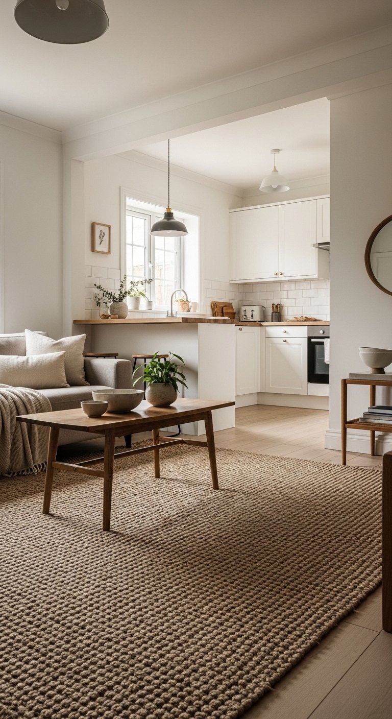 A large rug can quietly divide your open kitchen living room layout without using walls. Place a textured rug under the seating area to mark the living space. Choose natural materials like jute or soft woven fabric to add warmth while keeping the look light.The key is size. A small rug makes the room feel broken, but a large rug that fits under all furniture creates a clear zone. Keep the kitchen flooring simple so the rug stands out as the main divider. You can also match rug colors with small kitchen details like bar stools or dishware for a subtle connection.Use lighting to support this zone. A floor lamp over the rug adds a cozy feel, while brighter lighting in the kitchen keeps the work area clear. This simple idea creates structure without closing off your space.