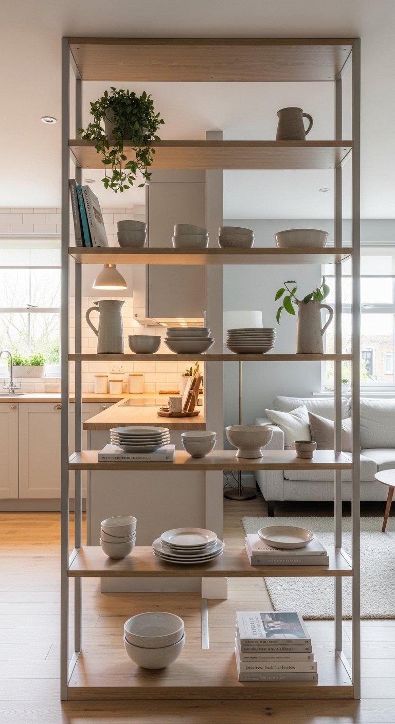 Open shelves can separate your living room kitchen combo while keeping the space airy. Instead of a solid wall, use a tall, open shelving unit that lets light pass through. This keeps both areas connected but still defined.Style the shelves carefully. Mix practical items like bowls or jars with decor such as books, plants, and small art pieces. Stick to a simple color palette so the shelf looks clean and not crowded. Use light wood or metal frames for a modern feel.Place heavier items on the lower shelves and lighter decor above to keep balance. This idea works well in small spaces because it adds storage without making the room feel closed. It also gives you a chance to show your personality while keeping the layout functional.