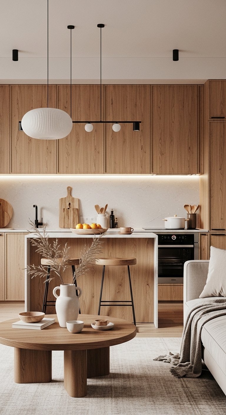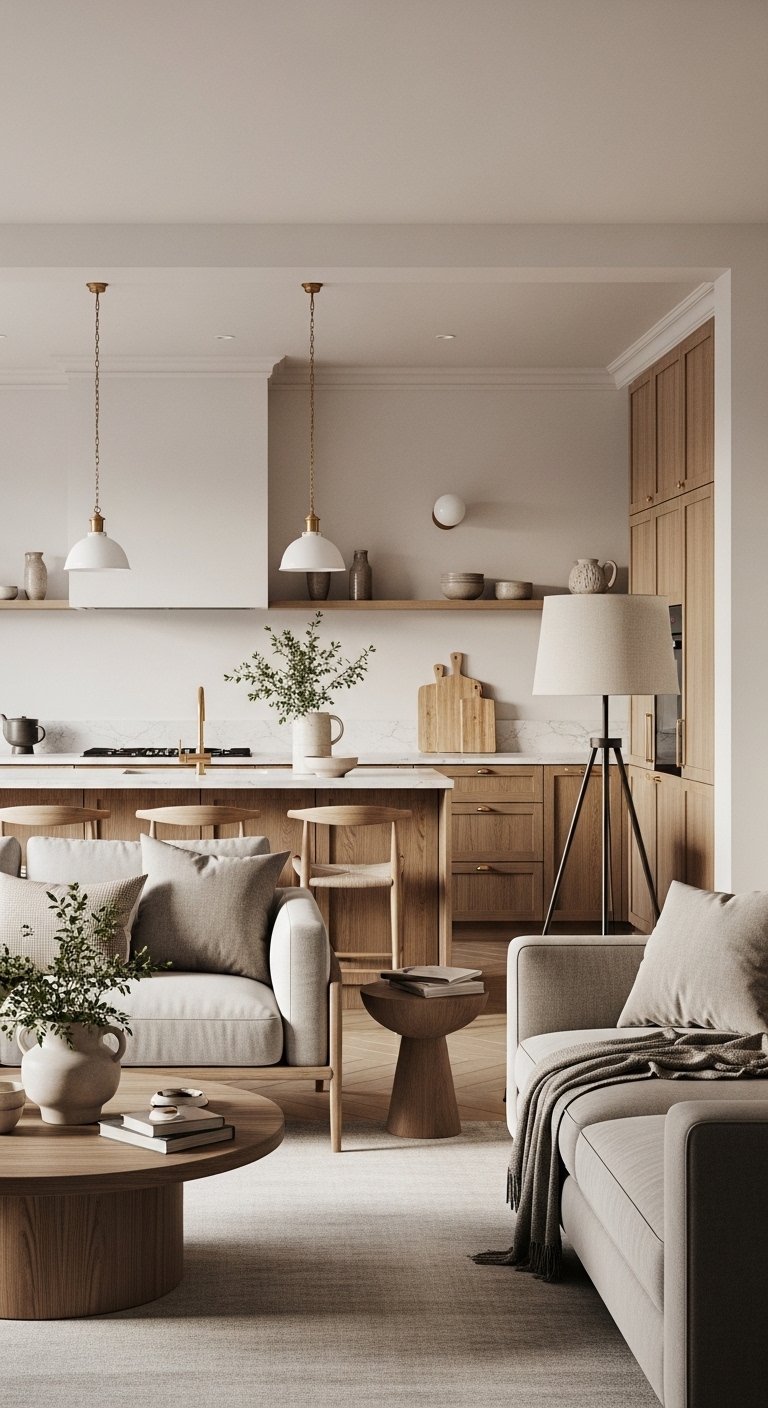A single feature wall can unify your living room and kitchen combo beautifully. Choose one wall that runs through both spaces and treat it as a continuous design element. You can use textured paint, subtle wallpaper, or wood panels.Keep the pattern soft and not too bold so it does not overwhelm the room. Light tones with gentle texture work best. You can add open shelves or simple art pieces along this wall to enhance the look.Make sure the colors connect with both kitchen and living elements. This creates a strong visual link across the space. It also gives your home a focal point that feels intentional and stylish without needing extra decoration everywhere else.