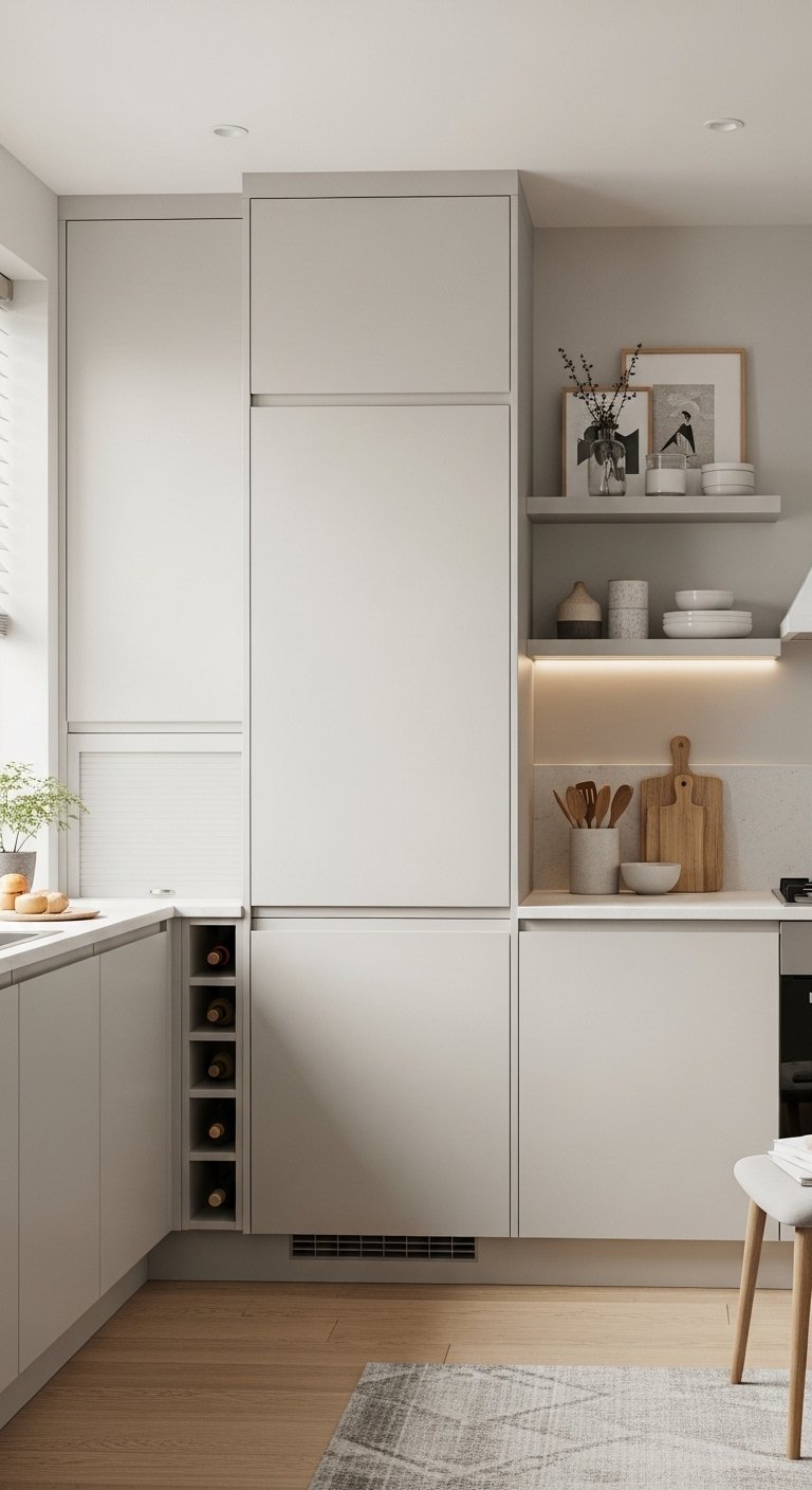 When floor space is limited, go up. Vertical storage is perfect for a small living room kitchen combo. Install tall cabinets or shelves that reach close to the ceiling. This draws the eye upward and makes the room feel taller.In the living area, use wall-mounted shelves for books, decor, or plants. In the kitchen, use vertical cabinets to store less-used items. Keep the color of these units light so they do not feel heavy.Avoid overcrowding shelves. Leave some empty space to keep the look clean and breathable. Add soft lighting like wall sconces to highlight vertical lines. This idea maximizes storage while keeping your space open and visually balanced.