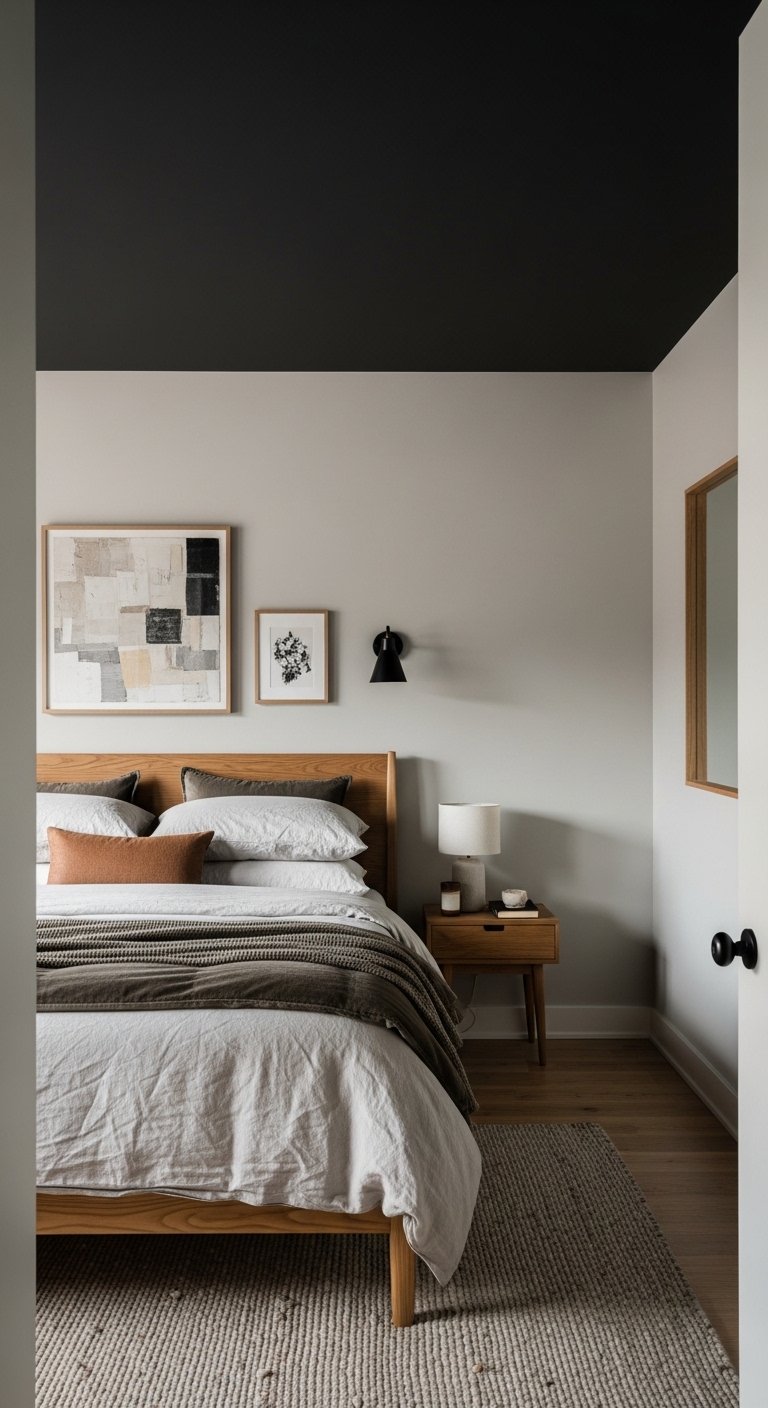 Dark ceilings add unexpected drama and intimacy to a bedroom. Paint the ceiling deep charcoal, navy, or even black to create a cocoon-like effect. Balance it with lighter walls, soft textiles, or neutral furniture so the space doesn’t feel oppressive. Highlight the ceiling with hanging pendants, chandeliers, or pendant lights, drawing the eye upward and making the ceiling a design focal point. Add layered textures such as velvet bedding, silk curtains, or wool rugs to complement the moody tone. The result is a visually compelling room that feels cozy yet grand. A dark ceiling offers a Pinterest-worthy twist on traditional design, turning your bedroom into an intimate, stylish retreat where every corner feels thoughtfully curated and inviting.
