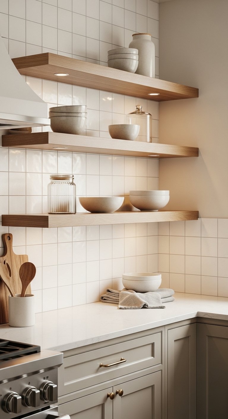 A mixed material backsplash combines tile with built-in wood shelving. Install simple white tiles across the wall, then break the pattern with floating wood shelves. This layered look adds warmth and function. Use the shelves for dishes, jars, or decor. Choose warm oak shelves for contrast or walnut for a richer feel. The tile keeps the wall easy to clean, while wood softens the space. Under-shelf lighting highlights both materials. This design works especially well in small kitchens needing storage and style. Keep the tile simple so the wood stands out. The result feels custom, practical, and visually balanced.