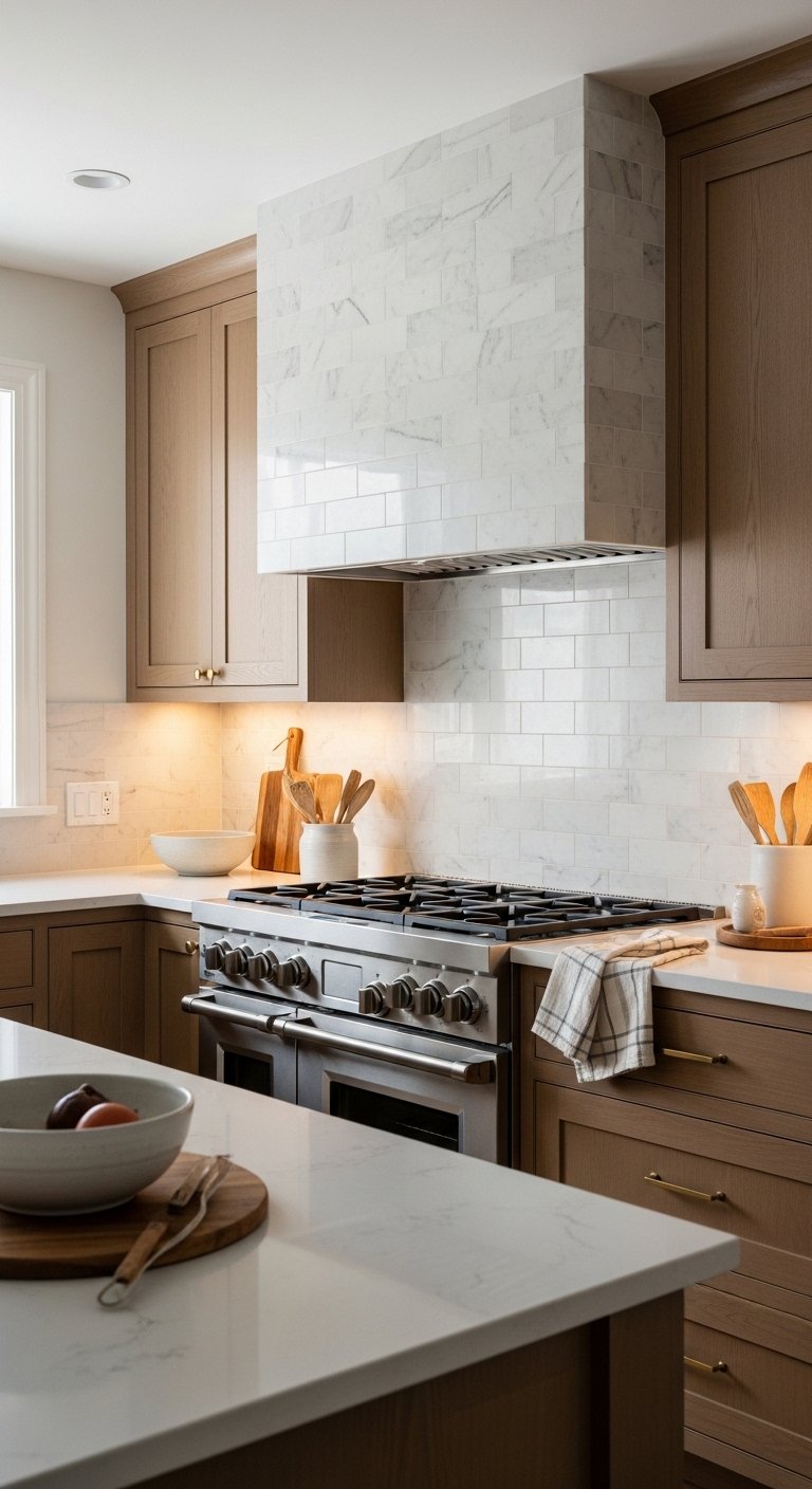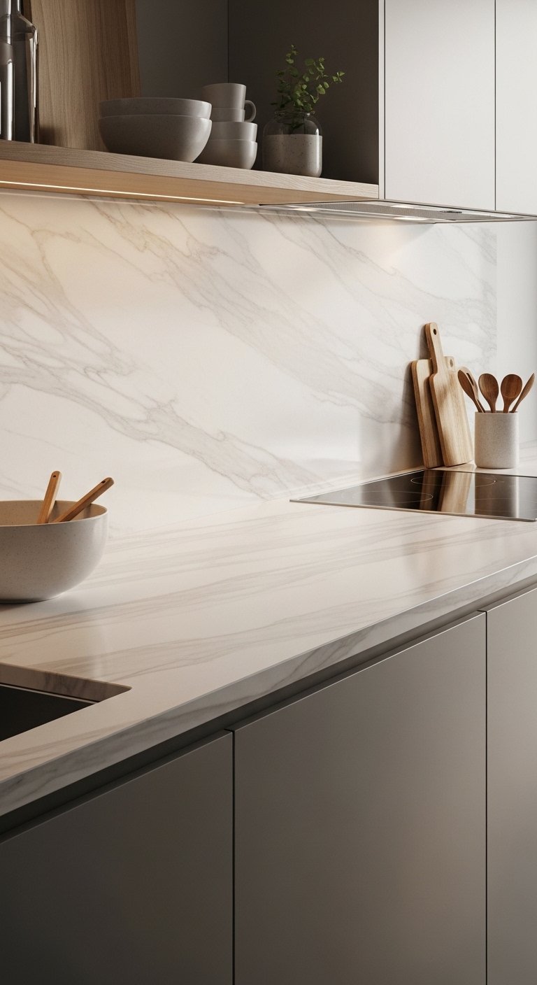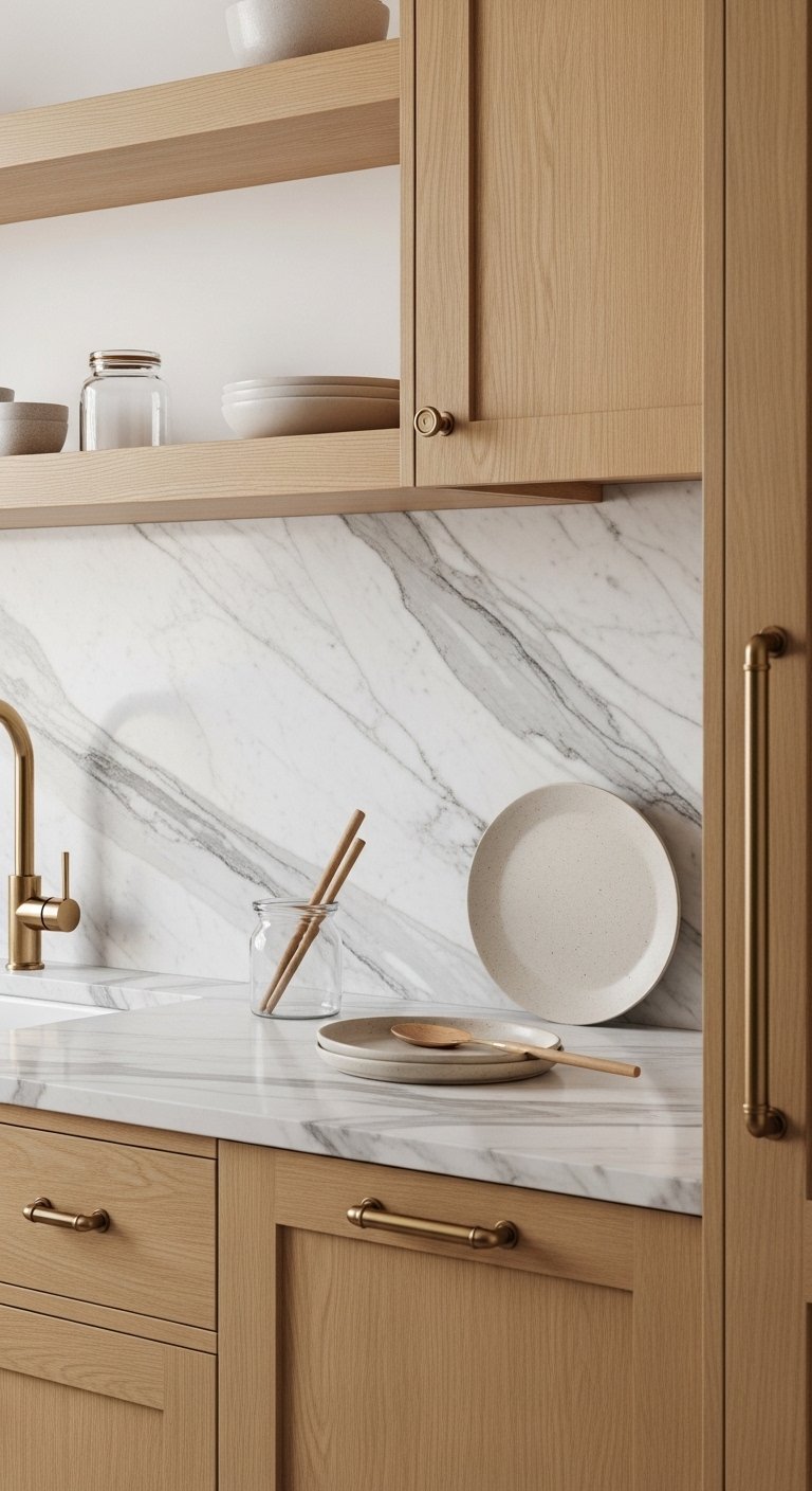 A full slab marble backsplash creates a smooth, uninterrupted surface that instantly upgrades your kitchen. Instead of tile lines, one large slab shows natural veining that flows across the wall. This design makes the kitchen feel bigger and more refined. Choose soft gray veining for a calm look or bold dramatic veins for a statement wall. Continue the same slab from countertop to backsplash for a seamless finish. This approach reduces visual breaks and keeps cleaning simple. Pair with warm wood cabinets to soften the stone or use white cabinets for a bright, airy result. Subtle under-cabinet lighting enhances the natural pattern and adds depth at night. This backsplash works beautifully in both modern and classic kitchens. If marble feels high maintenance, quartz with marble-look veining gives the same visual effect with easier care.
