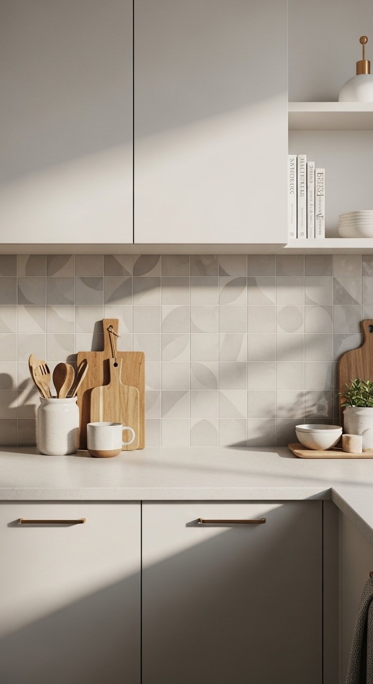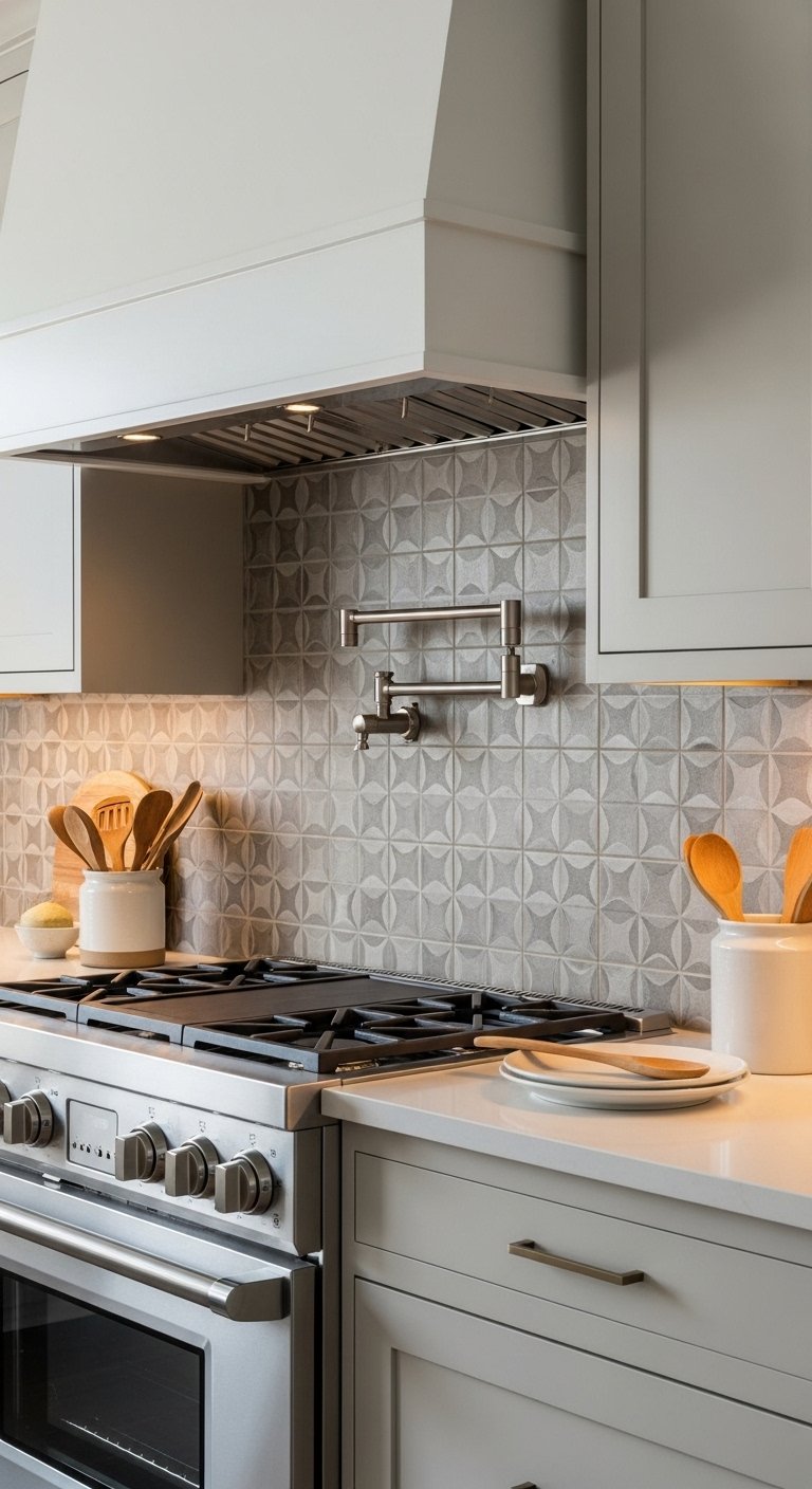 A patterned cement tile backsplash introduces personality and artistic charm. Choose soft geometric or floral patterns in muted tones like gray, beige, and faded blue. These tiles create a focal point behind the stove or sink. Keep surrounding cabinets simple so the pattern stands out. Pair with neutral countertops to avoid visual clutter. Under-cabinet lighting enhances the pattern details and adds depth. This backsplash works well in kitchens that need visual energy. Use the patterned tile only in one section if you prefer a subtle look. The result feels unique, creative, and highly Pinterest-worthy while still practical.