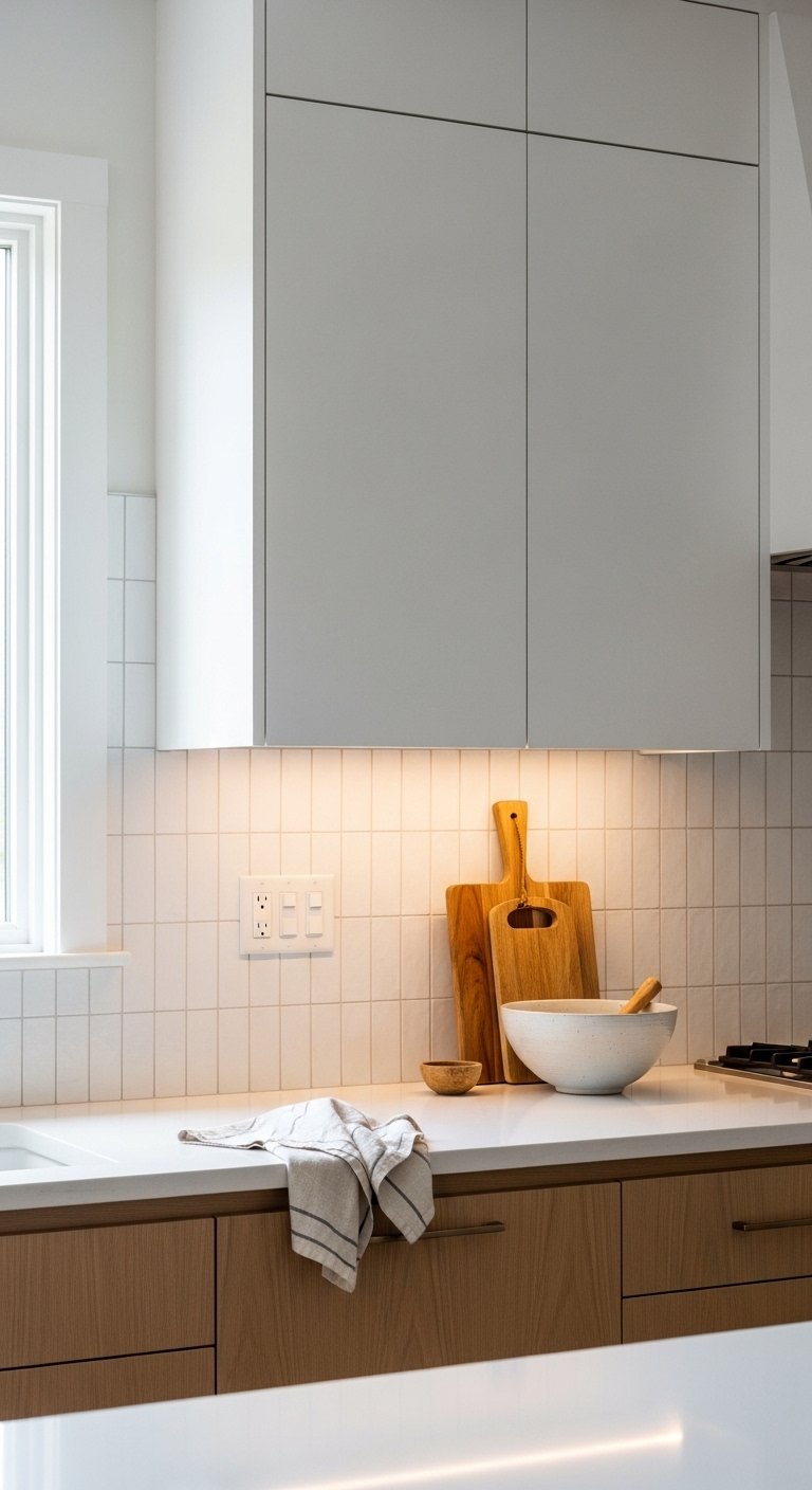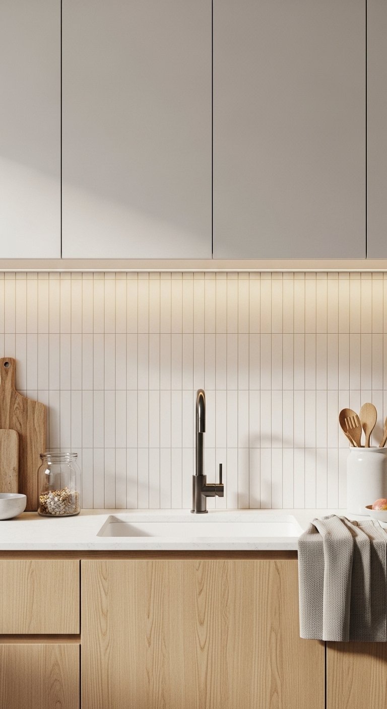 A vertical stacked backsplash instantly makes your kitchen feel taller and more modern. Instead of the classic horizontal subway layout, stack slim tiles vertically from countertop to cabinet. This simple change creates clean lines and draws the eye upward. Use soft white tiles with light gray grout for a calm look, or choose warm beige tiles for a cozy feel. Pair this backsplash with flat-panel cabinets and minimal hardware to keep the design balanced. Under-cabinet lighting enhances the vertical shadows and highlights the texture beautifully. For small kitchens, this layout removes visual clutter and makes the wall appear seamless. If you want more depth, choose handmade tiles with slight surface variation. The uneven finish catches light differently throughout the day. This design works especially well behind a range or sink where you want a focal point without overwhelming the space.