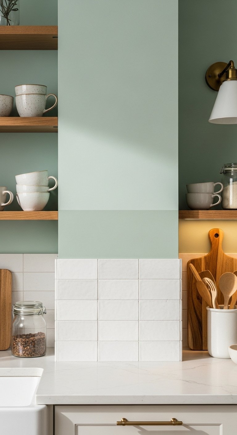 A half wall backsplash design creates a layered and airy kitchen look. Install tile from countertop to mid-wall, then paint the upper section in a soft complementary color. For example, use warm white tiles below and muted sage paint above. This approach keeps the kitchen light while still protecting key areas. It also allows you to introduce color without committing to a full wall of tile. Pair with open shelving to highlight both materials. Under-cabinet lighting defines the tile area and adds warmth. This design works especially well in smaller kitchens where full tile might feel heavy. The result feels balanced, fresh, and easy to update later.
