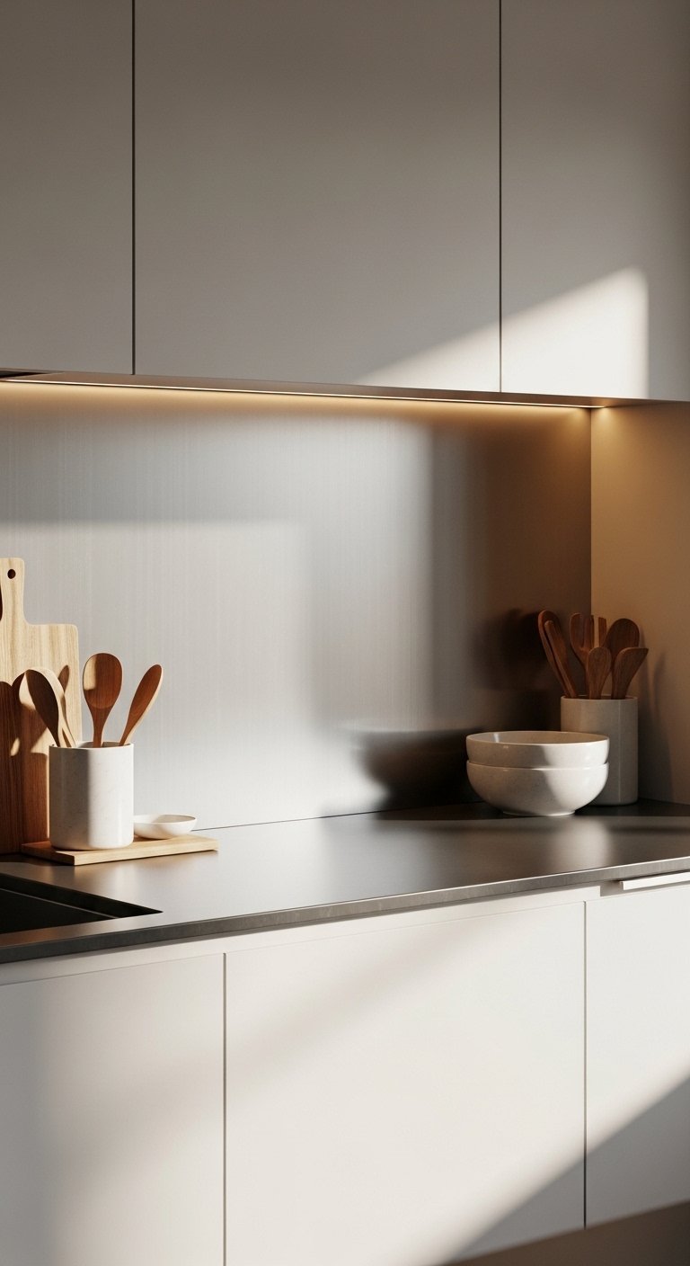A metal sheet backsplash creates a smooth and contemporary kitchen surface. Stainless steel or brushed aluminum panels reflect light softly and feel clean. This design works beautifully in modern kitchens with flat cabinets. Pair with warm wood tones to balance the cool metal finish. The seamless surface makes cleaning easy, especially behind cooking areas. Under-cabinet lighting creates soft reflections across the panel. This backsplash also protects walls from heat and splashes. Choose brushed finishes instead of glossy for a softer appearance. The result feels sleek, minimal, and professional without needing complex tile layouts.