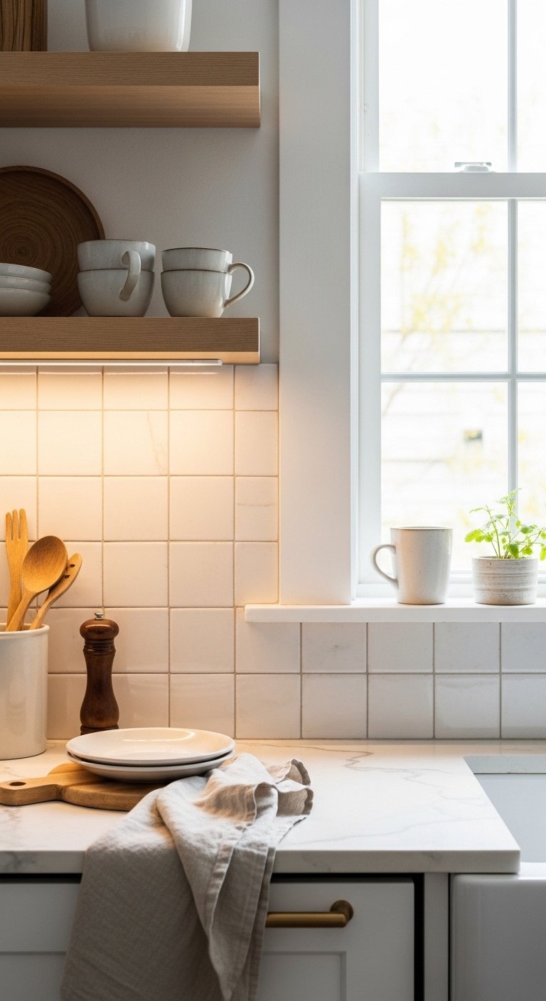 A Zellige tile backsplash adds handcrafted character and gentle shine. These tiles have slightly uneven surfaces that reflect light in different ways, creating movement without bold patterns. Soft white, sage green, or dusty blue colors work beautifully for a calm kitchen. Install the tiles in a simple grid layout to let the texture stand out. Use matching grout for a seamless look or contrast grout for subtle definition. This backsplash pairs well with brass hardware and natural wood shelves. During the day, sunlight creates soft highlights across the surface. At night, warm under-cabinet lighting enhances the handmade feel. Zellige tiles also hide small splashes and smudges better than glossy flat tiles. This makes them practical for busy kitchens while still looking elegant and warm.