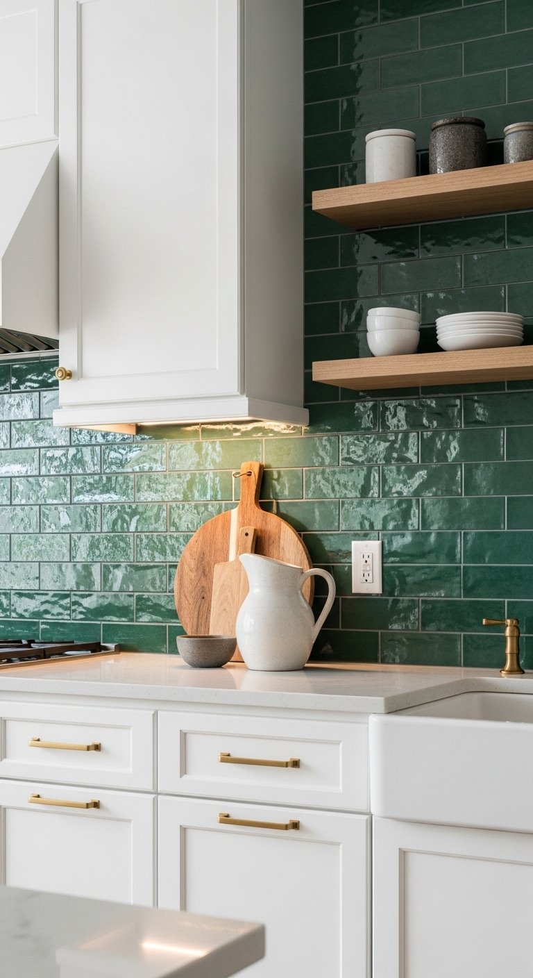 A glossy emerald backsplash instantly energizes a neutral kitchen. Deep green tiles reflect light and create rich contrast against white or wood cabinets. Use rectangular tiles in a stacked layout for a modern feel. The glossy finish bounces light around the room, making the color feel vibrant but not heavy. Pair with brass hardware for warmth or matte black fixtures for contrast. Keep countertops simple so the backsplash stands out. Under-cabinet lighting enhances the glossy surface and deep tone. This design works especially well in kitchens with natural light. If you want a softer version, choose muted forest green instead of bright emerald. The result feels bold, stylish, and Pinterest-worthy.