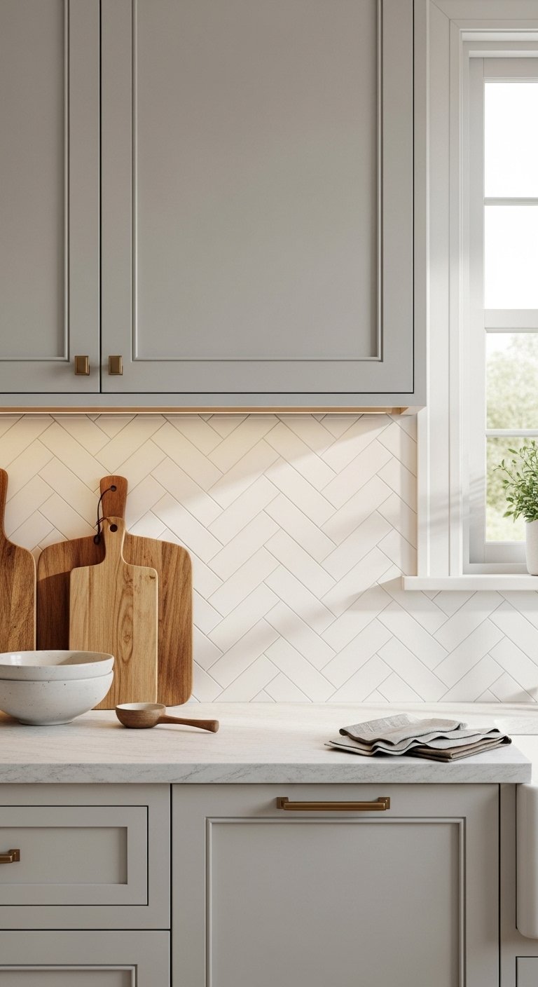 A herringbone backsplash adds movement and elegance to any kitchen. The angled layout draws attention and creates subtle visual energy. Use soft white tiles for a clean classic look or warm beige tiles for a cozy feel. Extend the herringbone pattern behind the range for a focal point. Matching grout keeps the design calm, while darker grout highlights the pattern. This layout pairs beautifully with shaker cabinets and warm wood accents. Under-cabinet lighting enhances the angled lines and texture. The pattern works well in both small and large kitchens because it adds interest without heavy color. Choose slightly handmade tiles for more depth. The result feels timeless but still fresh.