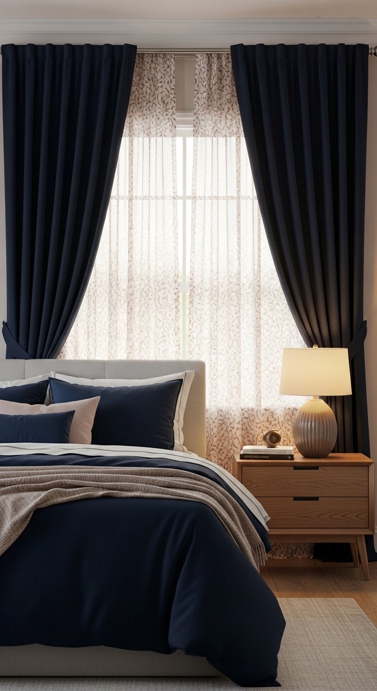 Combine navy drapes with patterned sheer curtains to create an elegant, layered look. The navy drapes anchor the room, while sheer curtains in subtle patterns, like geometric shapes or floral motifs in muted white or blush, soften the overall aesthetic. This allows natural light to filter gently, brightening the space without washing out the deep tones. Layered window treatments also add texture and dimension, making your room feel luxurious and inviting. For Pinterest-ready styling, pair with a small potted plant on the windowsill, metallic curtain tiebacks, and cozy seating nearby. Coordinating bedding or a rug with hints of the sheer pattern ties the look together. This approach makes a navy bedroom feel airy, stylish, and thoughtfully designed, showing how layering textiles can enhance both comfort and visual impact.