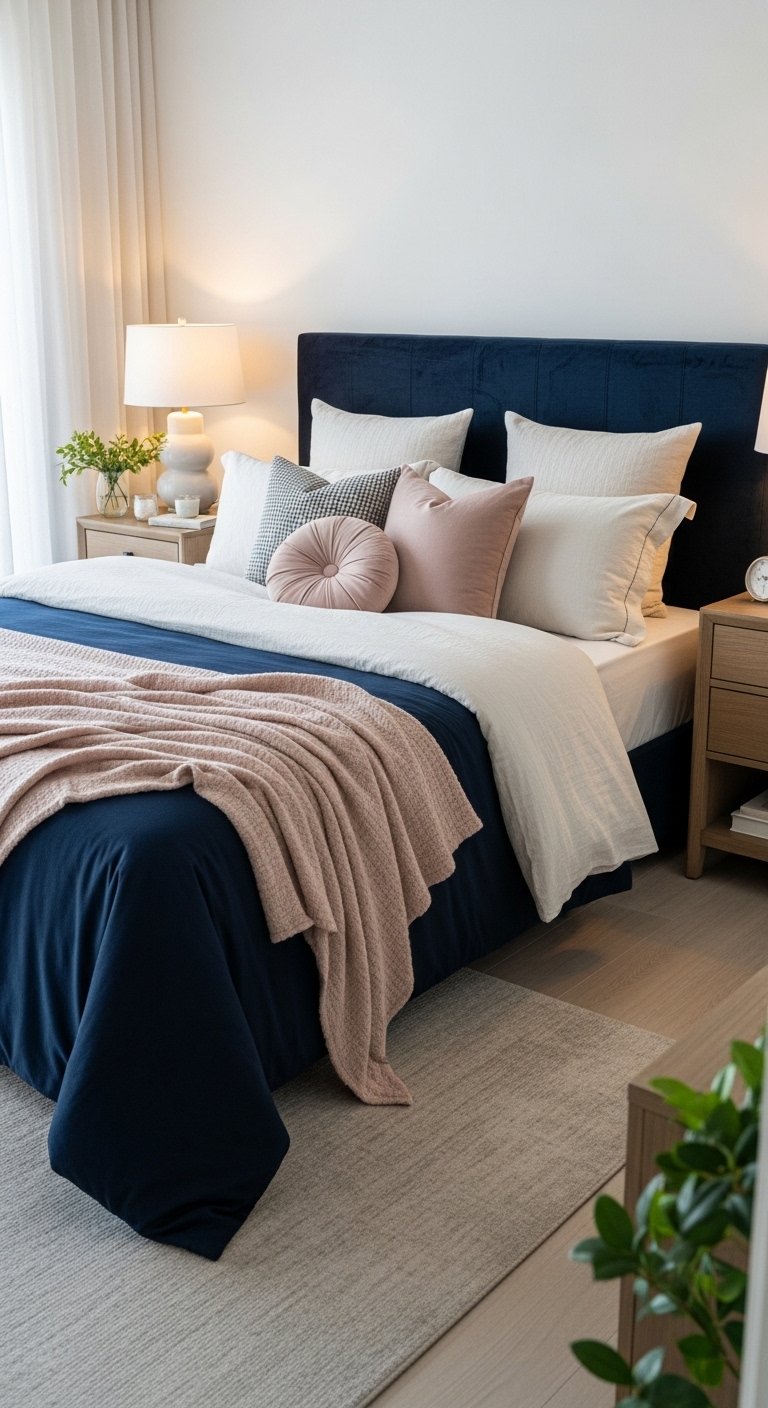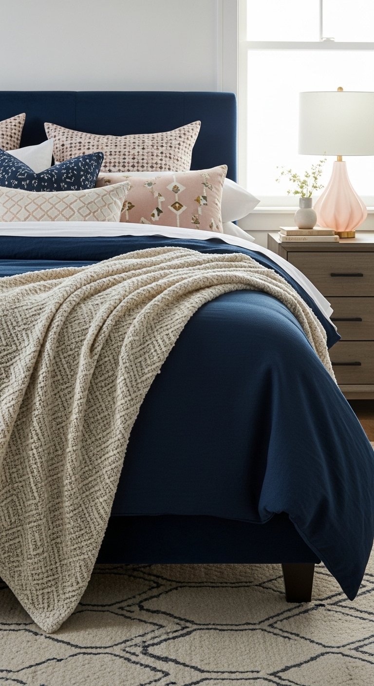 Layering textiles in a navy bedroom transforms depth into style. Start with a navy velvet headboard or quilt, then introduce patterned pillows in muted gold, blush, or white tones. A silk or linen curtain in a lighter shade of blue softens the walls while adding tactile contrast. Rugs with navy accents or subtle geometric patterns can anchor the bed and tie the room together. Mixing textures like velvet, cotton, silk, or woven fabrics prevents the space from feeling flat, creating a Pinterest-worthy visual hierarchy. Arrange pillows and throws in layered clusters to create a sense of abundance and curated style. Even small touches, like a textured navy throw over a chair or a knitted cushion, enhance the tactile feel. This strategy makes a navy bedroom feel cozy, visually interesting, and luxurious, giving the room elegance without being heavy or overwhelming.