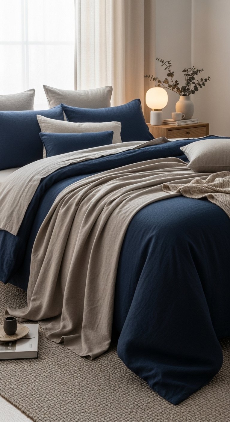 2. Navy Bedding with Contrasting Natural Linen