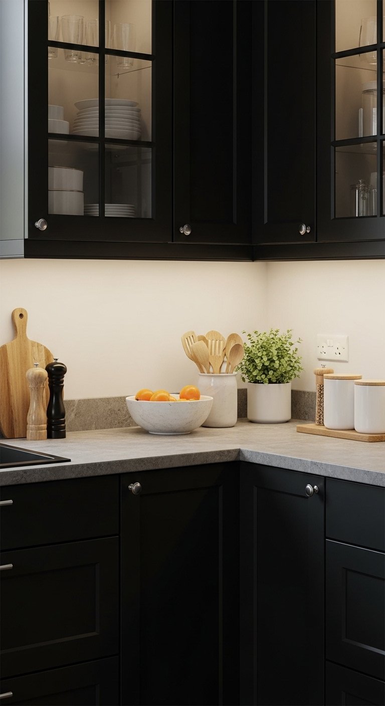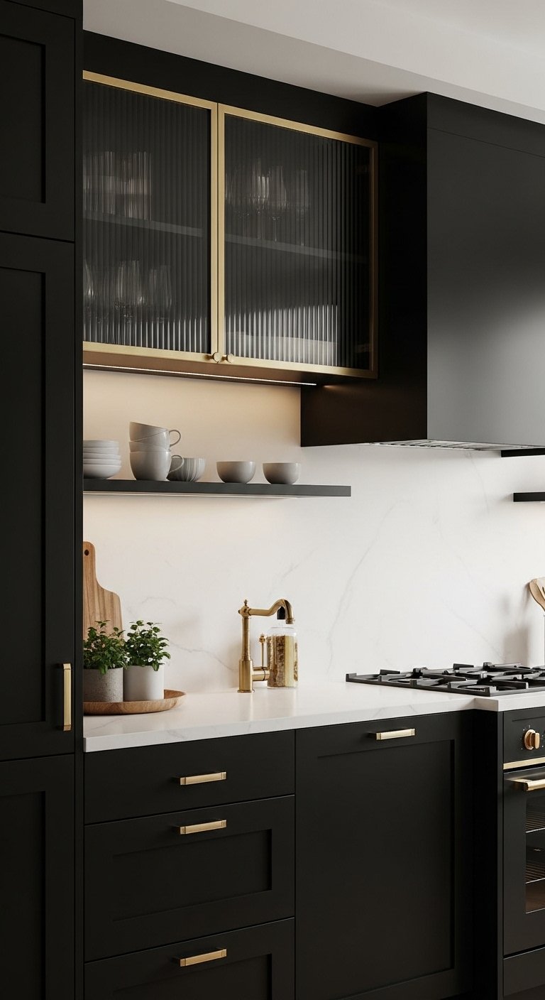 Frosted or textured glass in black cabinetry creates a stunning balance between drama and openness. The semi-transparent panels reveal stylish dishware or glassware collections, adding personality and visual interest. Combine with interior cabinet lighting to cast a soft glow, accentuating textures and creating a welcoming atmosphere. The glass breaks up the black expanses without compromising luxury, offering a subtle play of opacity and transparency. Perfect for showcasing curated items or decorative accents, this approach adds depth, dimension, and Pinterest-worthy elegance. The interplay of light, shadow, and carefully styled interiors makes every glance at your kitchen feel intentional and sophisticated.