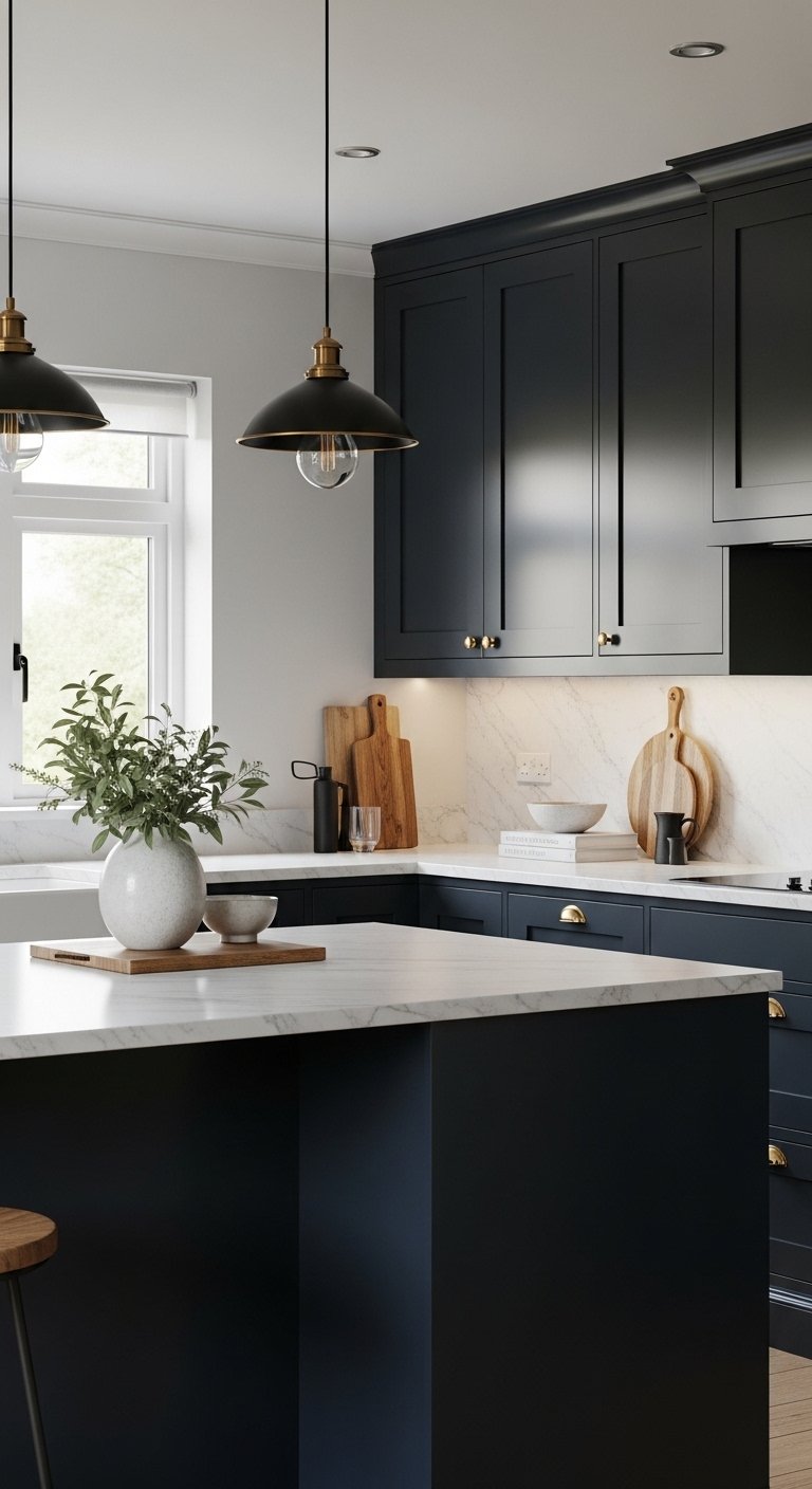 A two-tone black kitchen with a contrasting island in deep green, navy, or charcoal creates a stunning visual anchor. The island serves as both a functional prep area and a centerpiece for entertaining. Complement with luxurious materials like marble countertops, velvet or leather stools, and statement lighting to unify the look. This contrast prevents monotony while enhancing depth, dimension, and style. Pinterest users are drawn to two-tone kitchens because they balance boldness with creativity, offering an elevated, curated aesthetic that feels modern and approachable.