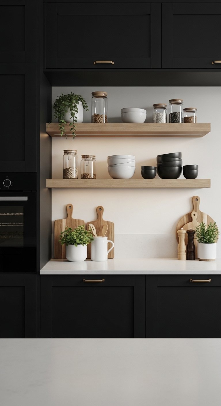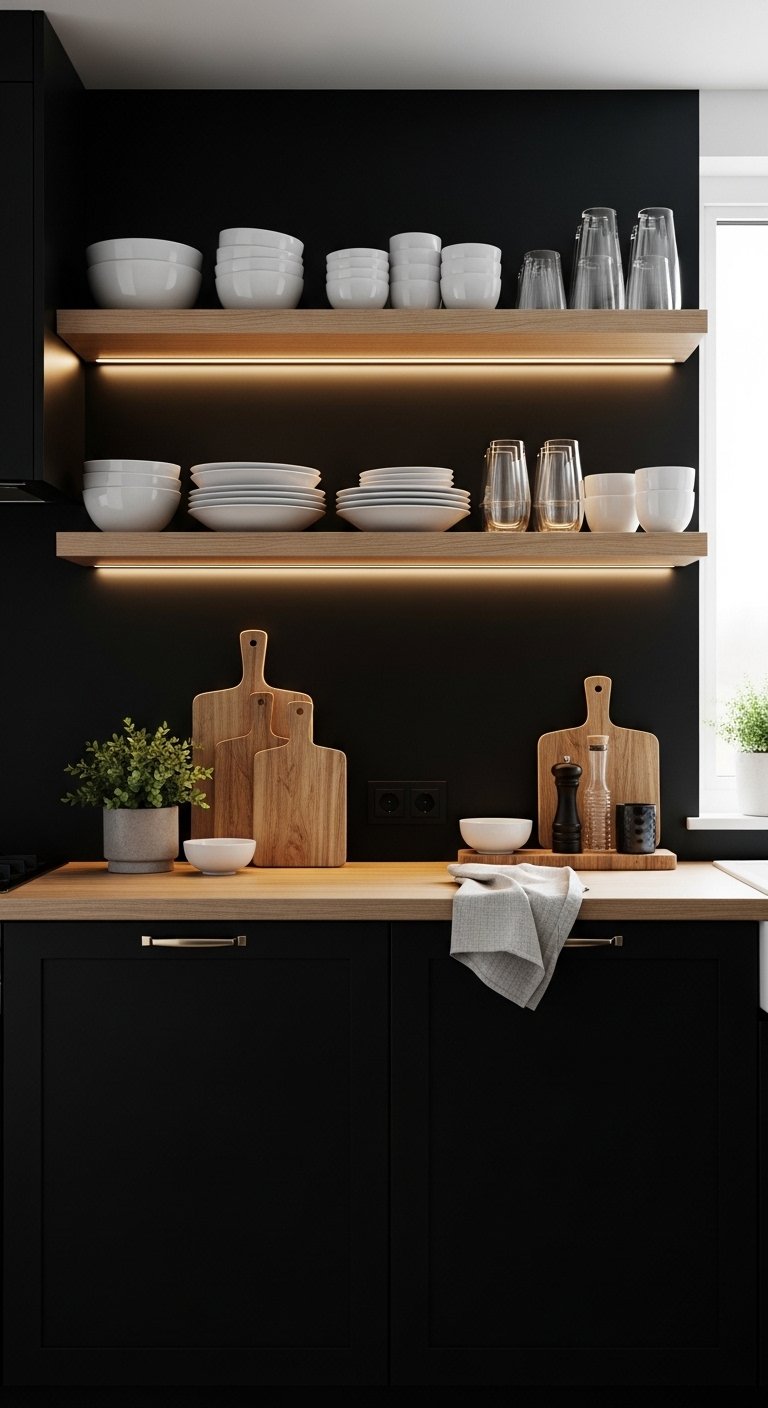 Open shelving in a black kitchen creates a sense of airiness and breaks up solid cabinetry while adding practical storage. Floating shelves in light wood, black, or brushed metal allow display of curated dishware, cookbooks, or decorative items, creating depth and visual interest. Add LED lighting beneath each shelf to highlight contents and introduce a warm, inviting glow. This design encourages creativity and personalization, letting the kitchen tell a story while maintaining a high-end look. Combining open shelving with closed black cabinetry balances drama and function, keeping the space sleek yet approachable. Pinterest users love this approach because it shows a luxury kitchen that feels lived-in, stylish, and highly functional, demonstrating how display and storage can coexist elegantly.