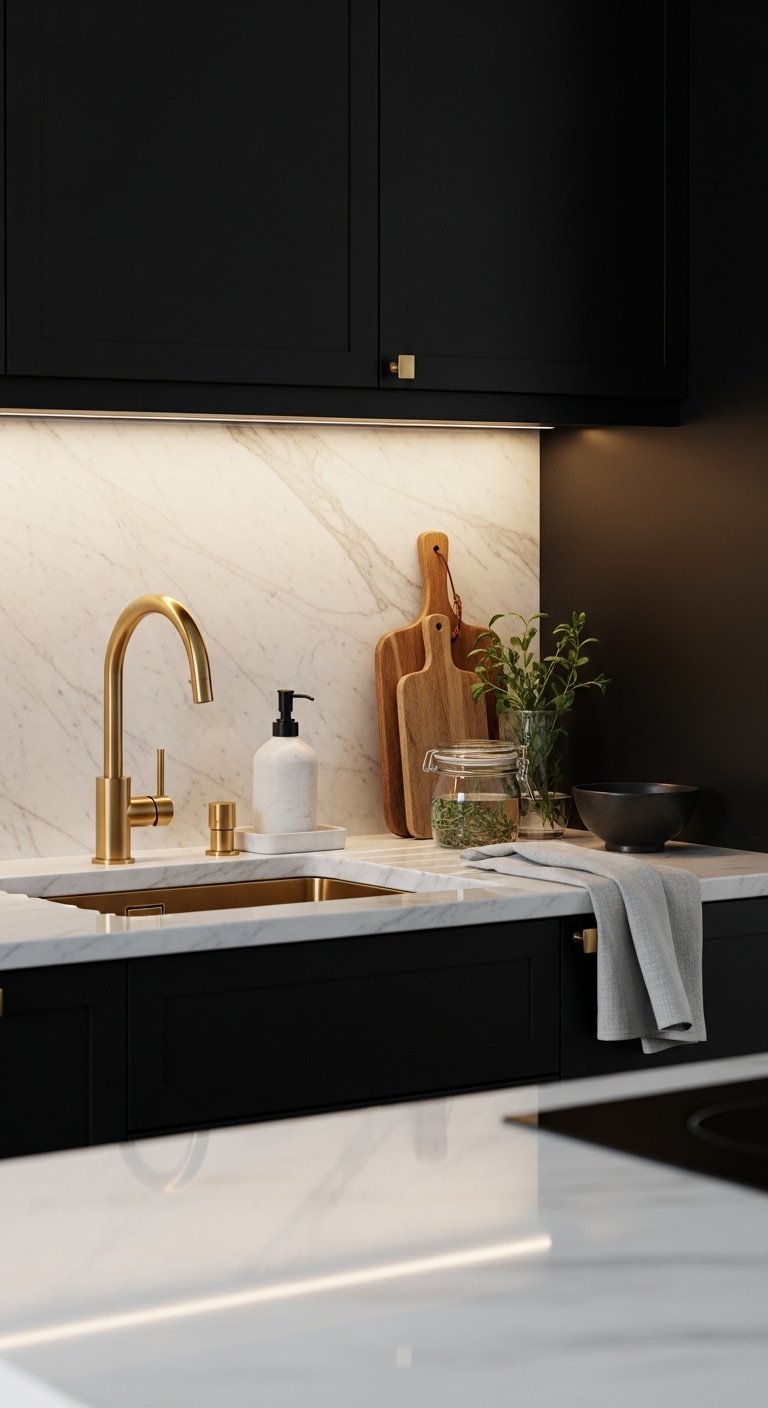 A matte black kitchen instantly radiates sophistication, and pairing it with brushed gold hardware transforms it into a luxurious sanctuary. The soft glow of gold against deep black cabinetry adds warmth, while matte finishes keep the look modern and grounded. Imagine a space where every handle, faucet, and pendant light echoes this elegant contrast. For countertops, creamy marble or soft quartz provides a bright counterbalance, and strategically placed under-cabinet lighting highlights textures, adding depth and inviting ambiance. This combination ensures the kitchen feels bold without being overwhelming, creating a space that’s both striking and welcoming. Perfect for Pinterest, this design exudes editorial-quality style that feels high-end yet approachable.