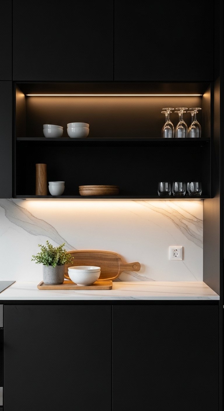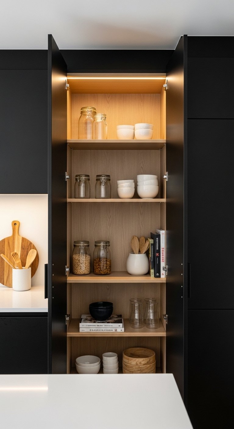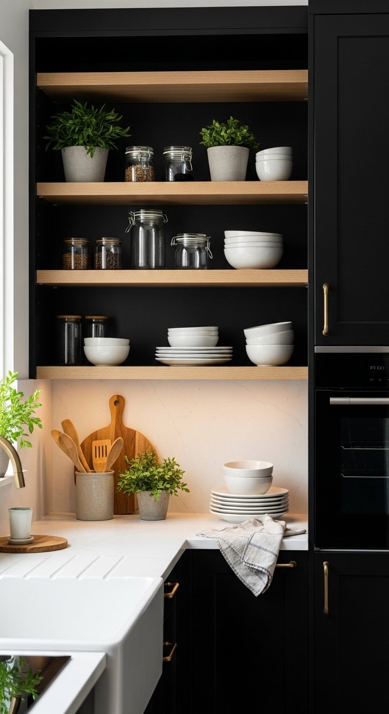 An open pantry in a black kitchen introduces warmth, accessibility, and visual depth. Light wood or white shelves framed by black cabinetry create contrast while displaying curated dishware, glassware, and decorative accents. Add integrated LED lighting to illuminate each shelf, turning everyday storage into a luxury feature. This approach softens the boldness of black, making the space feel approachable and inviting. Pinterest users love this strategy because it balances drama with practicality, showing how bold design can still be functional and styled with personality.