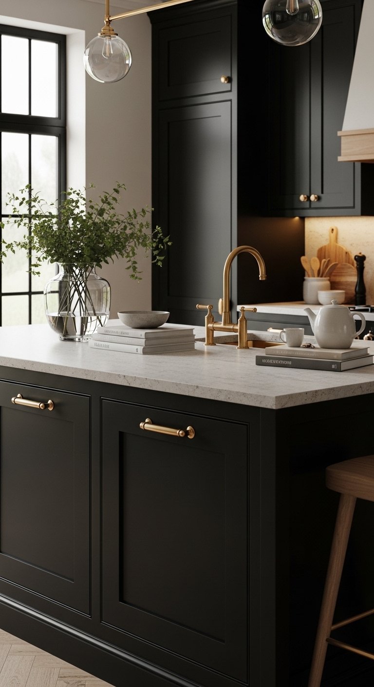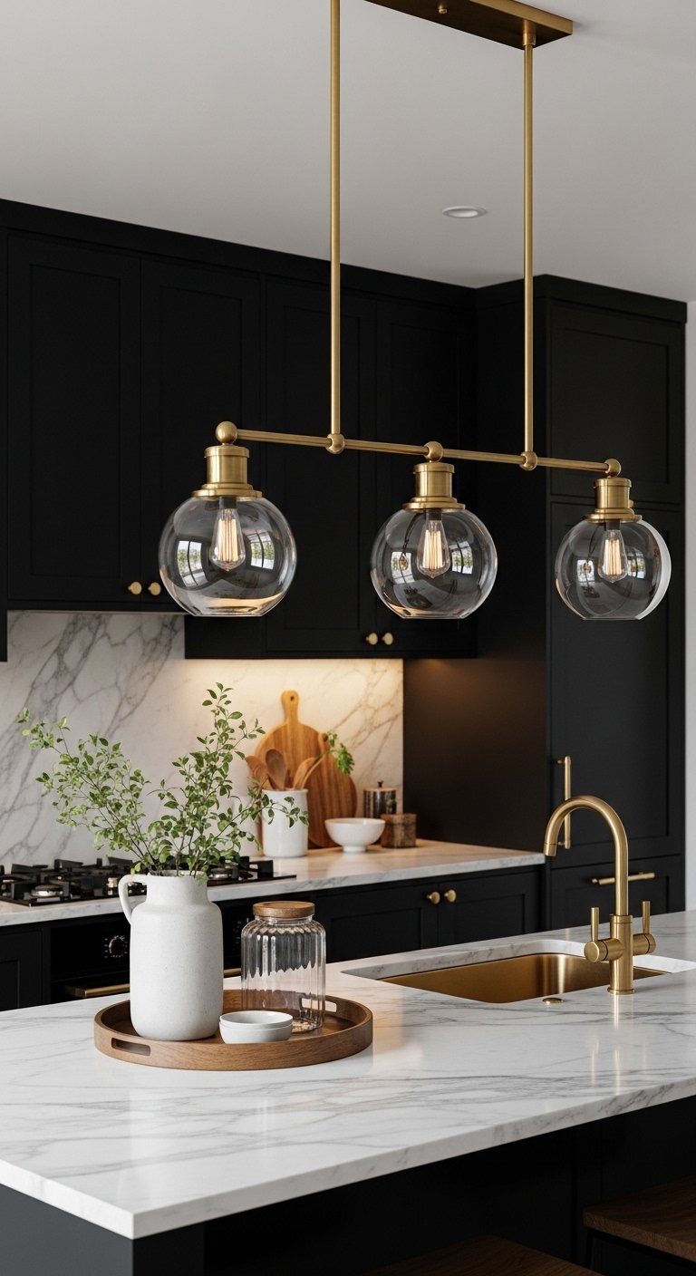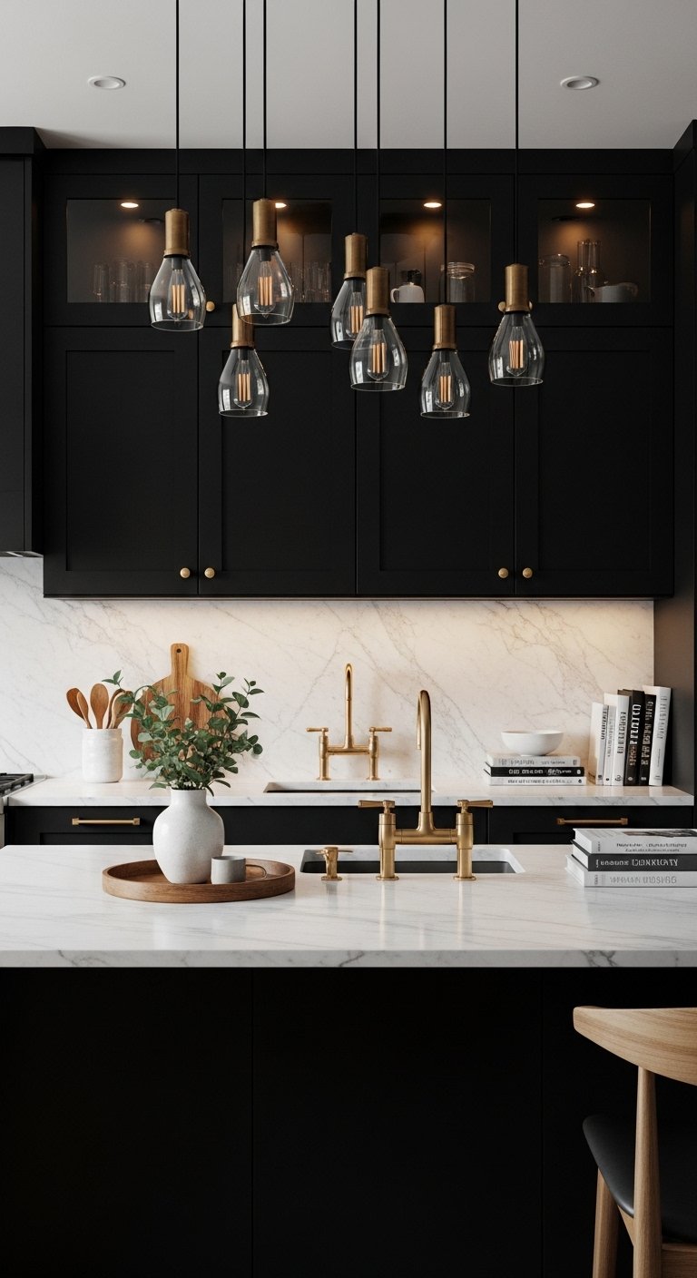 Brass fixtures, from faucets to pendant lights, provide warmth and luxury against black cabinets. The reflective quality of brass adds a soft glow, creating a sense of depth and richness in the space. Use a brass pot filler over a sleek cooktop, or a statement chandelier above the island, to create focal points that feel intentional and glamorous. Pair with neutral countertops or backsplashes to highlight the contrast. The combination of dark cabinetry and warm metallics achieves a high-end, Pinterest-worthy look, offering both practicality and dramatic elegance in a kitchen designed to impress.