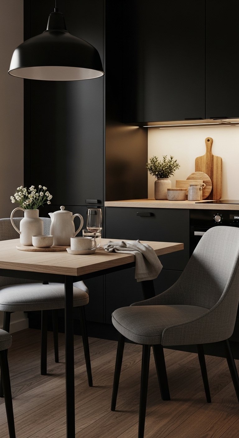 Pairing black cabinets with soft gray walls creates a sophisticated, balanced contrast that softens the kitchen’s boldness. Gray tones act as a neutral canvas, making the dark cabinetry stand out without feeling overwhelming. Imagine a kitchen where deep black drawers and cupboards anchor the room while muted gray walls reflect natural light, subtly illuminating the space. This combination works beautifully with wooden accents, light countertops, or metallic fixtures, creating depth and warmth. Add under-cabinet lighting to highlight textures, and consider floating shelves in wood or matte black for functional styling. The result is a luxurious yet approachable kitchen, perfect for Pinterest boards focused on modern elegance. The soft gray backdrop also allows decorative elements, such as plants, art, or ceramics, to shine, creating a curated and inviting atmosphere that balances drama with comfort.