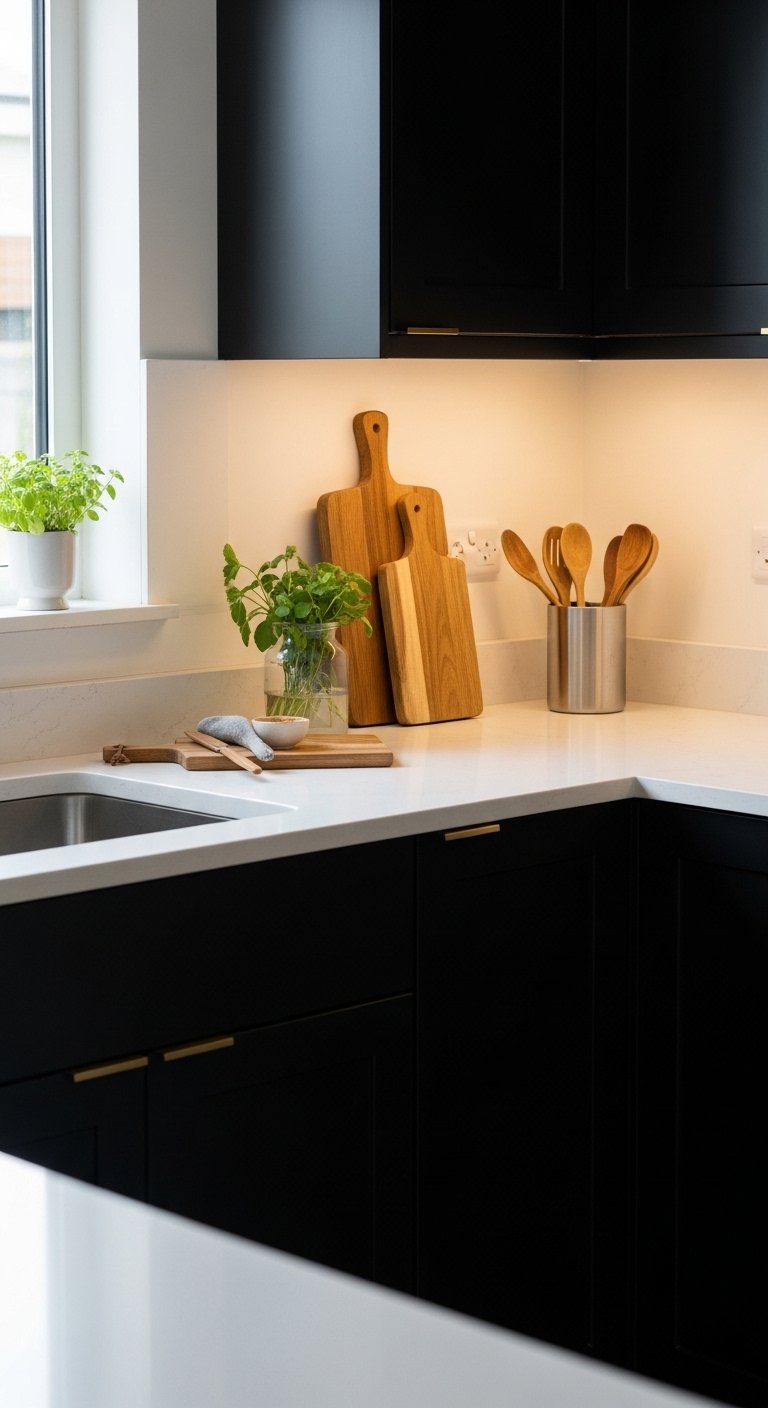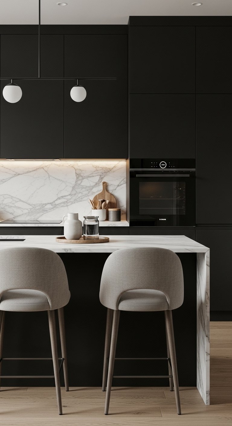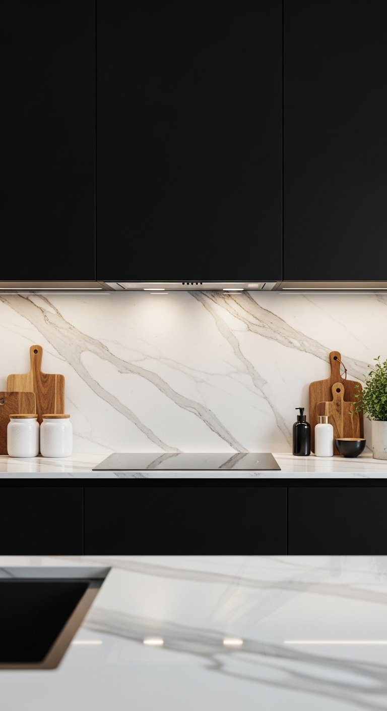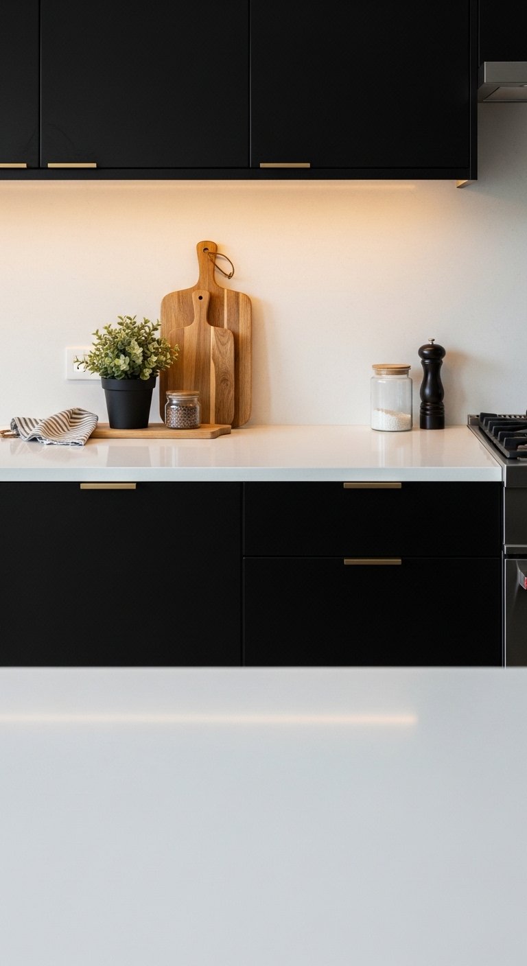 A black-and-white palette creates timeless luxury. Matte black cabinets topped with crisp white quartz countertops offer a bold, high-contrast aesthetic. The bright surface reflects light, keeping the space airy while emphasizing the cabinetry’s sleek design. Complement with metallic accents, light wood stools, or greenery for a balanced, inviting look. The contrast highlights architectural lines, textures, and design details, making the kitchen both practical and visually stunning. This classic combination is a Pinterest favorite because it feels modern, bold, and effortlessly elegant.