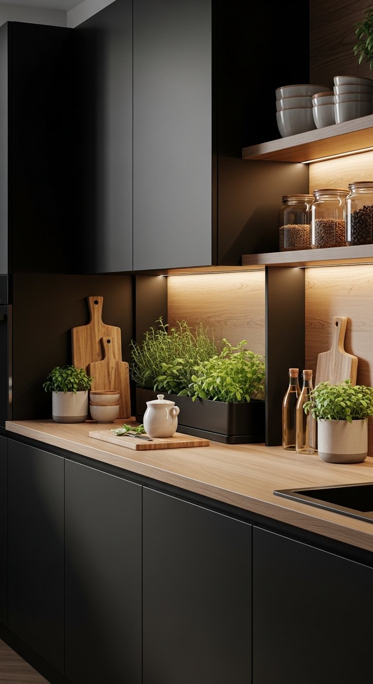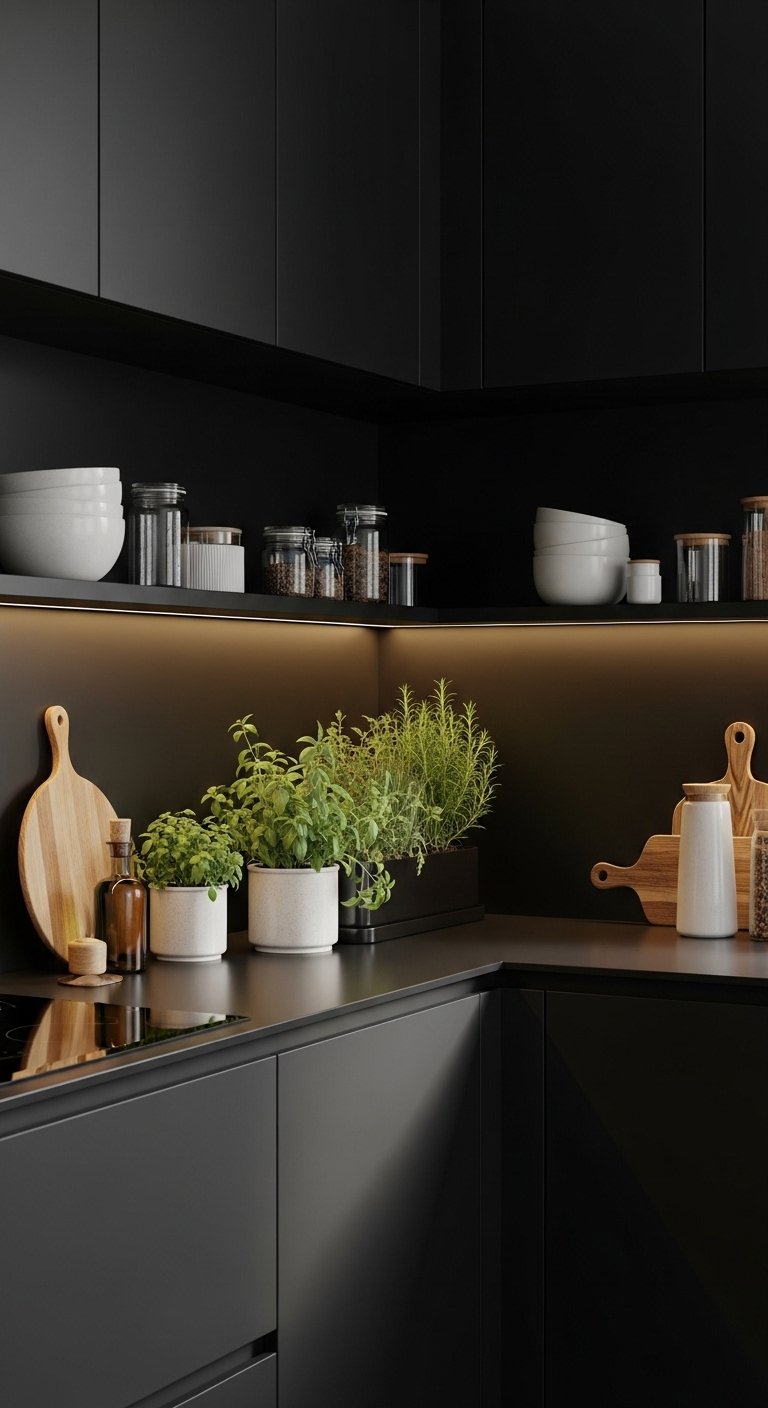 Adding an indoor herb garden introduces life, freshness, and practicality to a black kitchen. Small pots of basil, thyme, or rosemary placed on floating shelves, countertops, or windowsills bring vibrant green tones that pop against dark cabinetry. Black or metallic planters ensure cohesion with the design, while strategic natural or grow-light placement keeps plants thriving year-round. This design balances boldness with organic warmth, making the kitchen feel alive and functional. Pinterest users love this touch because it adds color, texture, and a sustainable, practical element to a luxurious, high-end space.
