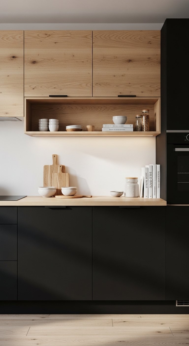 5. Black Cabinets with Warm Wood Accents