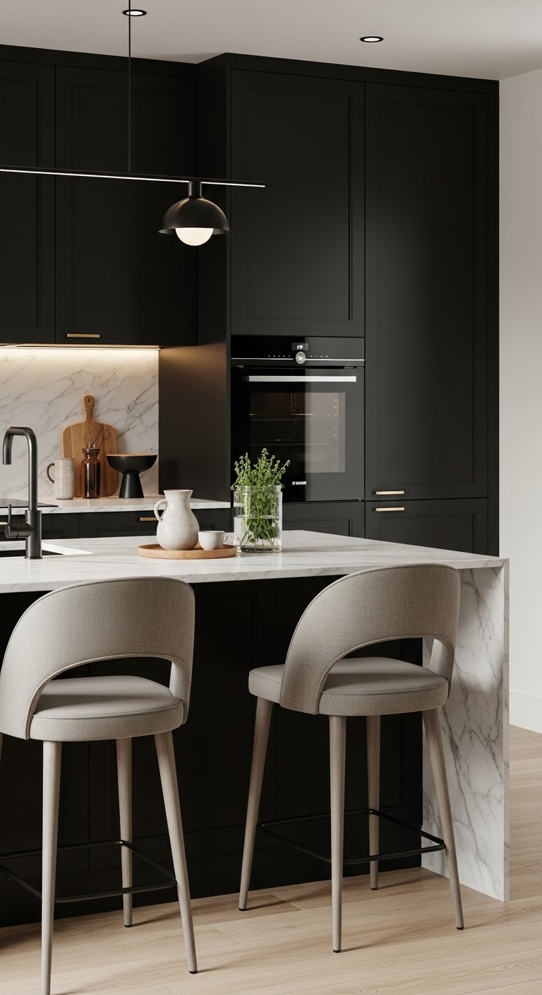 A black kitchen island with a cascading white marble waterfall countertop becomes the room’s ultimate focal point. The island’s dark base grounds the kitchen, while the marble’s natural veining introduces movement, brightness, and sophistication. Pair it with velvet or leather bar stools in neutral tones, and hang sculptural pendant lights above to add drama and elegance. This design merges luxury and functionality, offering ample prep space, seating, and style. Soft ambient lighting around the base or under the countertop enhances its sculptural quality. Pinterest boards adore this look because it feels curated, luxurious, and effortlessly modern—perfect for homes seeking both boldness and timeless appeal.