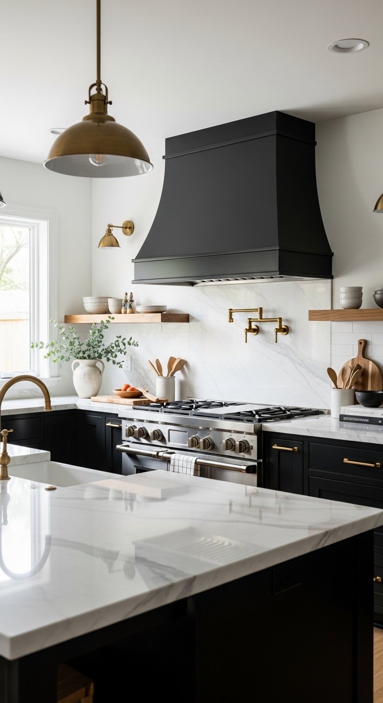 A statement range hood in a black kitchen instantly elevates the space from functional to luxurious. Matte black hoods with brass trim or sculptural metal designs become architectural focal points, drawing the eye and balancing the cabinetry. Surround it with a textured or light marble backsplash to highlight its presence, while soft under-cabinet lighting enhances both style and practicality. Integrate hidden spice racks or small shelves on the hood for added functionality without sacrificing aesthetics. The combination of bold black, metallic accents, and dramatic design makes this feature Pinterest-worthy, demonstrating how a functional element can double as a high-end design statement.
